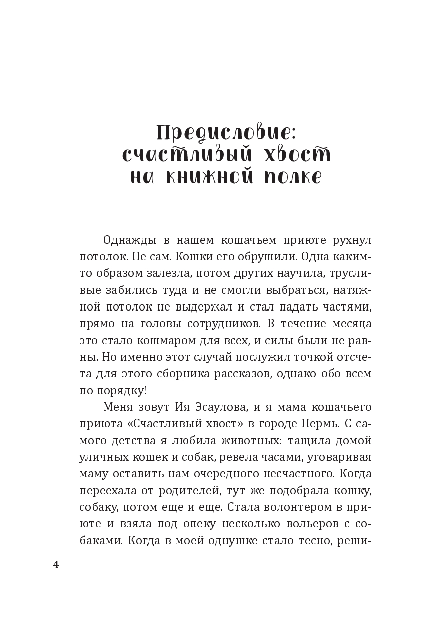 Однажды в кошачьем приюте "Счастливый хвост" обвалился потолок… А потом начались бесконечные траты на аренду помещения, транспорт, лекарства. И стало понятно, что без стабильной помощи, покрывающей хотя бы часть этих расходов, не обойтись. Так родилась идея проекта – сборник рассказов, средства от продаж которого помогут приюту чувствовать себя увереннее.