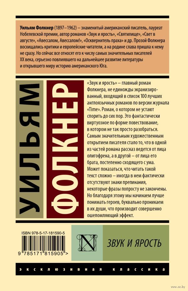 "Звук и ярость" – главный роман Фолкнера, не единожды экранизированный, входящий в список 100 лучших англоязычных романов по версии журнала "Time". Роман, о котором не устают спорить до сих пор. Это фантастически виртуозное по форме повествование, в котором не так просто разобраться. Самым значительным художественным открытием писателя стало то, что в одной из частей романа рассказ ведется от лица олигофрена, а в другой – от лица его брата, постепенно сходящего с ума. Может показаться, что читать такой текст сложно – иногда в нем фактически отсутствуют знаки препинания, некоторые попросту фразы не закончены. Но благодаря этому мы начинаем лучше понимать героев, буквально проникаем в их души, что производит совершенно ошеломляющий эффект.