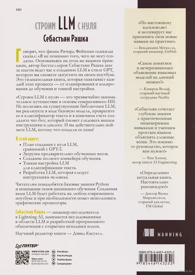 Говорят, что физик Ричард Фейнман однажды сказал: "Я не понимаю того, что не могу создать". Основываясь на этом же важном принципе, автор бестселлеров Себастьян Рашка шаг за шагом ведет вас к созданию LLM в стиле GPT, которую вы сможете запустить на своем ноутбуке. Это увлекательная книга, которая охватывает каждый этап процесса: от планирования и кодирования до обучения и тонкой настройки.