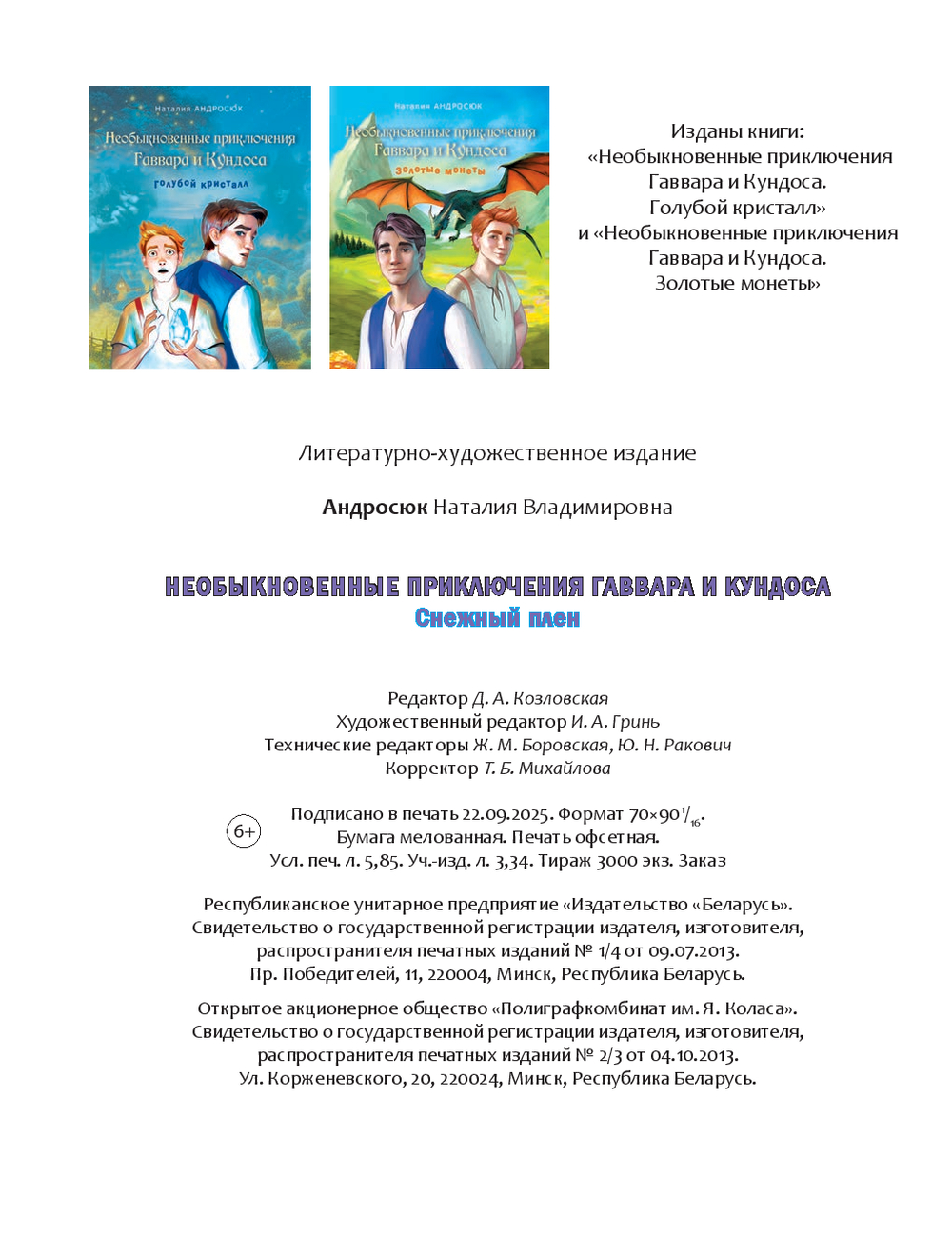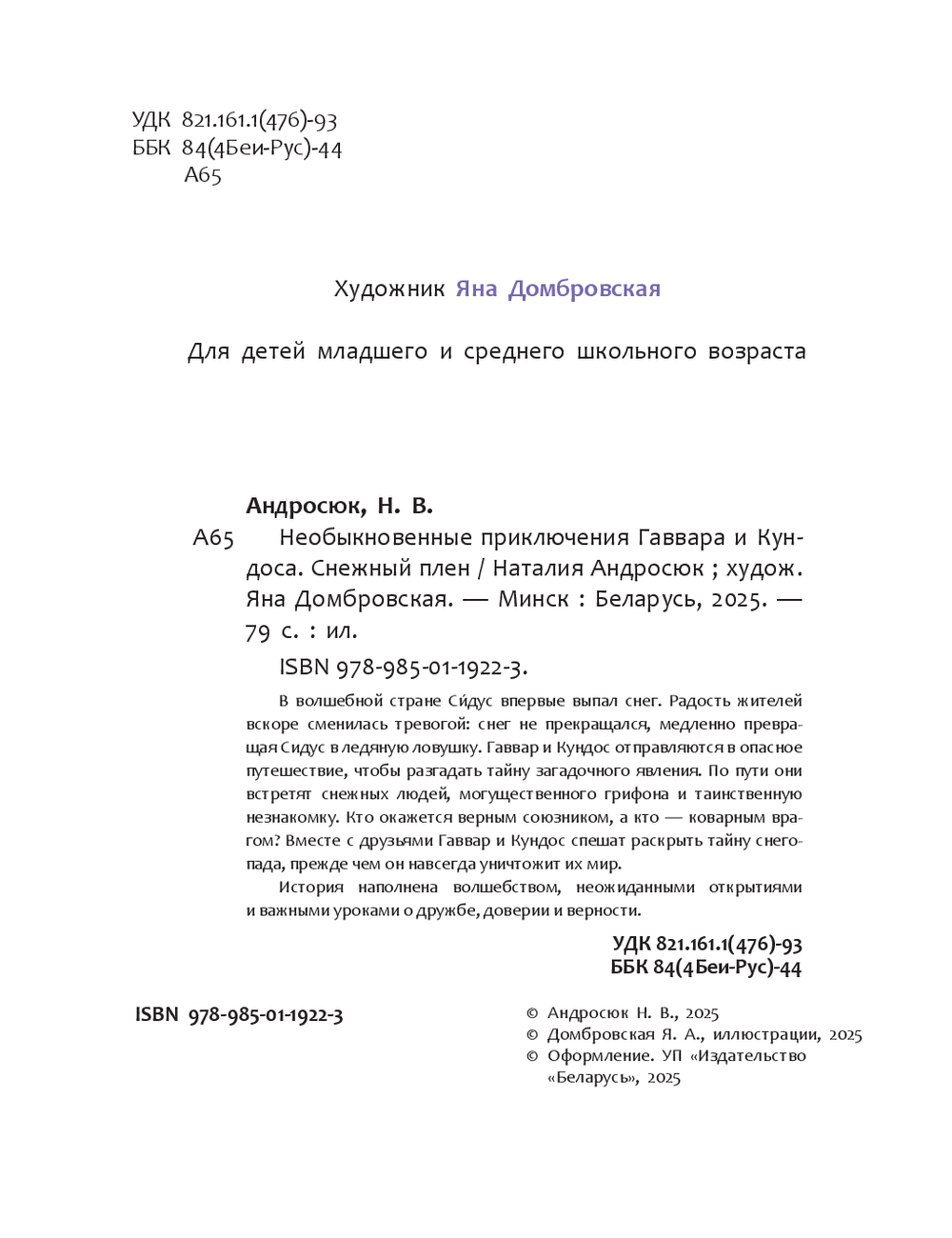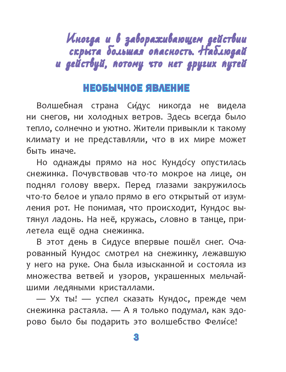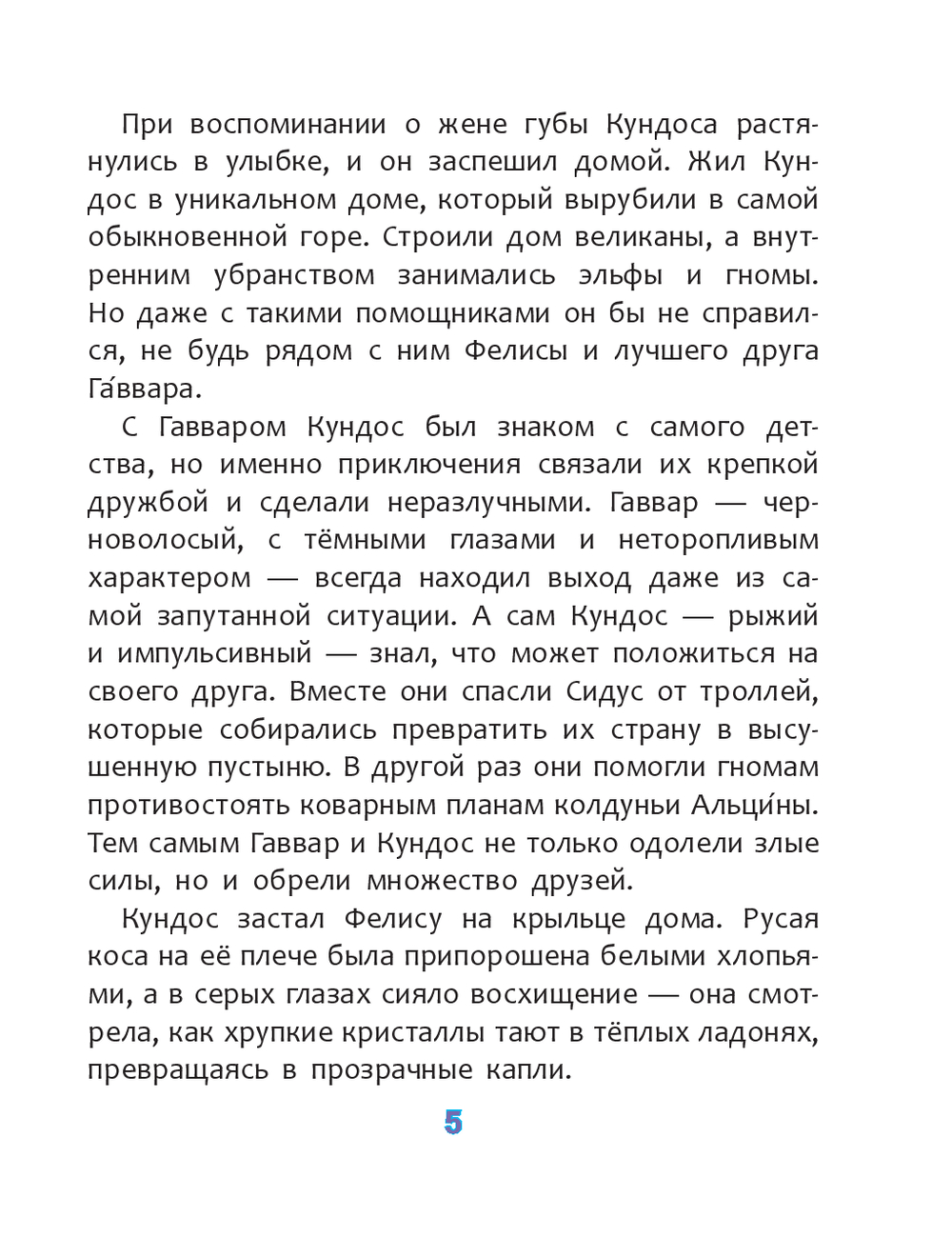 Идеальная фэнтези -сказка для зимнего сезона. Засыпанная снегом Вселенная волшебной страны Сидус ждёт своих маленьких читателей. Впечатляющие иллюстрации, сказочные грифоны, снежные великаны и вечная схватка добра со злом создают идеальное комбо для зимнего чтения после интенсивных спусков на санках и ватрушках. А если вы еще запасетесь шоколадными конфетами и душистым чаем, то получится двойное удовольствие. Смело открываем книгу и врываемся в круговорот зимних приключений двух отчаянных друзей ГАВВАРА и КУНДОСА. Что может случится,если снег не прекратится? Если он будет идти вечно и люди просто устанут его убирать и бороться с природой? Скорее всего дело не в природных силах, а в злом волшебстве, накликавшем атмосферное бедствие. Жители волшебной страны Сидус попали в снежный плен. Ловушка изо льда захлопнулась и никому не под силу вырваться из неё, но есть один маленький шанс. В этом цикле - посвящении сказкам А. Волкова мне понравилось небанальное восприятие автором своих героев. Они ошибаются,пробуют вновь и не опускают руки, даже если решения проблемы не видно на горизонте. Здесь есть место и для определенной философии, при этом отсутствует морализаторство поступков главных героев, что вдвойне не свойственно для детской сказки. Мы читали всей семьёй, поскольку,слушая нас по вечерам, наш папа тоже заинтересовался историей. А значит книга подходит для семейного чтения и отдыха. Продолжение приключений ГАВВАРА и КУНДОСА неожиданно удивило серьёзностью тем и масштабностью происходящих событий. Принимать вместе с горячим чаем, узорами мороза за окном и розовыми щеками