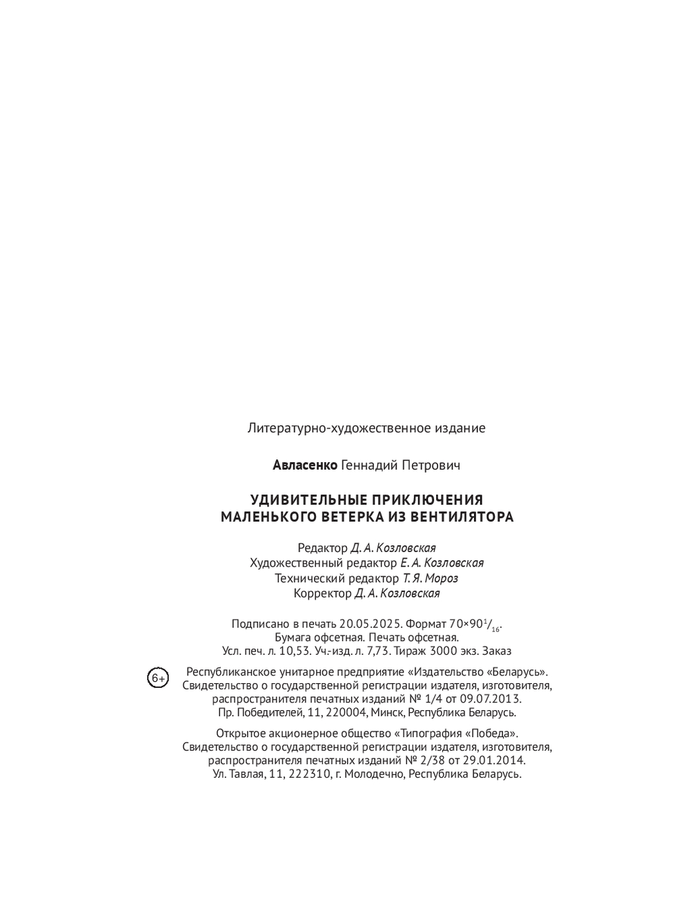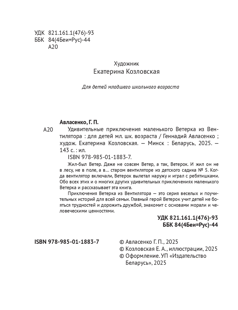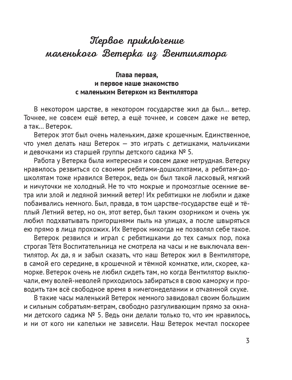 Жил-был Ветер. Даже не совсем Ветер, а так, Ветерок. И жил он не в лесу, не в поле, а в… старом вентиляторе из детского садика № 5. Когда вентилятор включали, Ветерок вылетал наружу и играл с ребятишками. Обо всех этих и о многих других удивительных приключениях маленького Ветерка и рассказывает эта книга.
