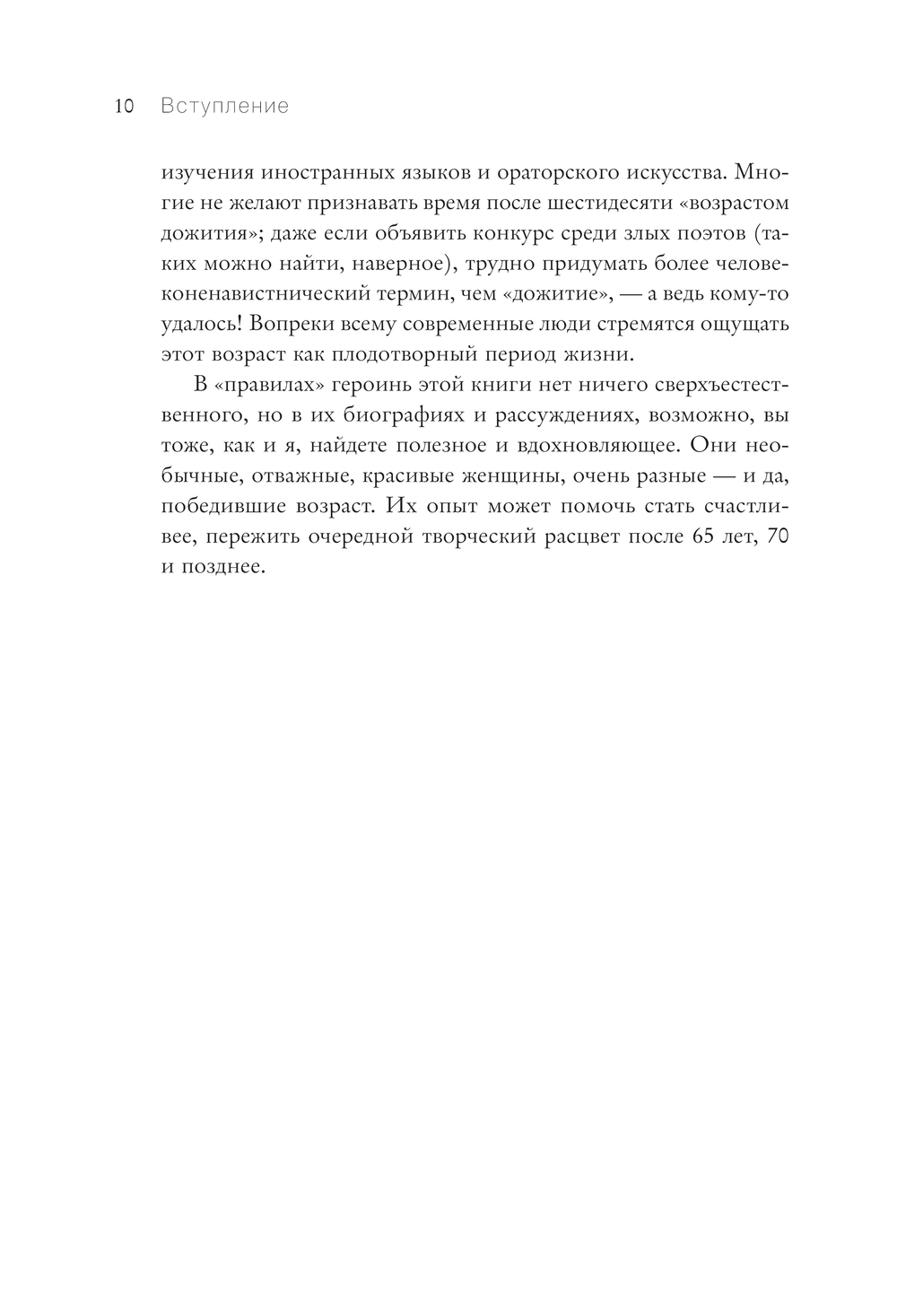 Сегодня люди старшего поколения пересматривают привычные представления о возрасте. Они продолжают любить, учиться, творить и открывать для себя мир. Журналист и искусствовед Елена Селестин приглашает читателя в увлекательное интеллектуальное путешествие по судьбам двенадцати выдающихся женщин, чей опыт показывает, что зрелость может стать лучшим временем для самореализации, новых свершений и увлечений.