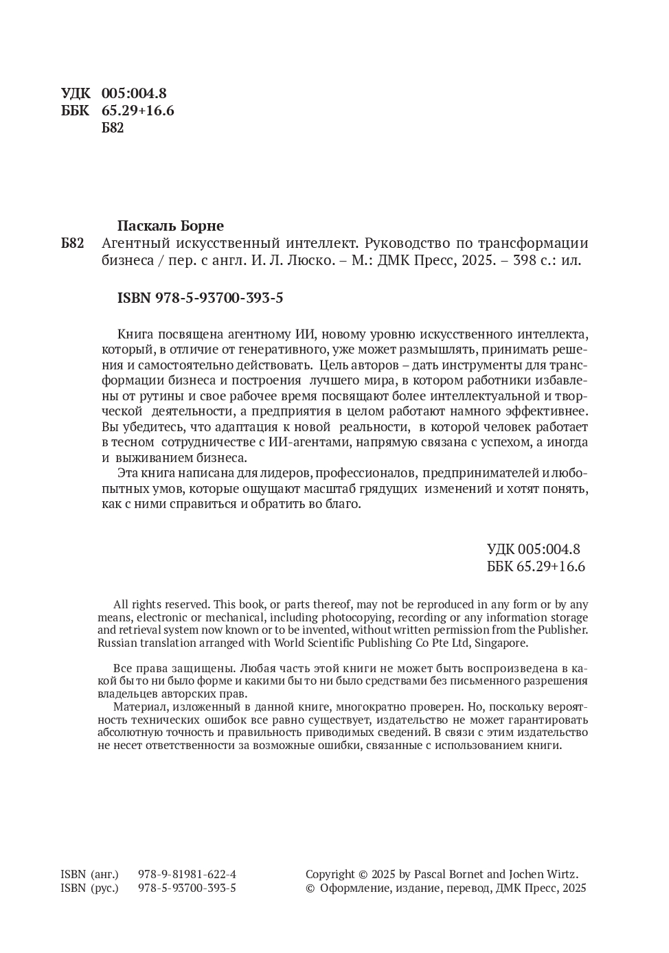Эта книга – практическое руководство по агентному ИИ для бизнес-лидеров, предпринимателей и пытливых умов. Автор Паскаль Борне, мировой эксперт в области интеллектуальной автоматизации, топ-менеджер с более чем 20-летним опытом руководства в сфере цифрового бизнеса, дает уникальную картину внедрения агентного ИИ в самых разных организациях от глобальных корпораций до гибких стартапов, – и вы станете свидетелями как впечатляющих успехов, так и поучительных неудач.