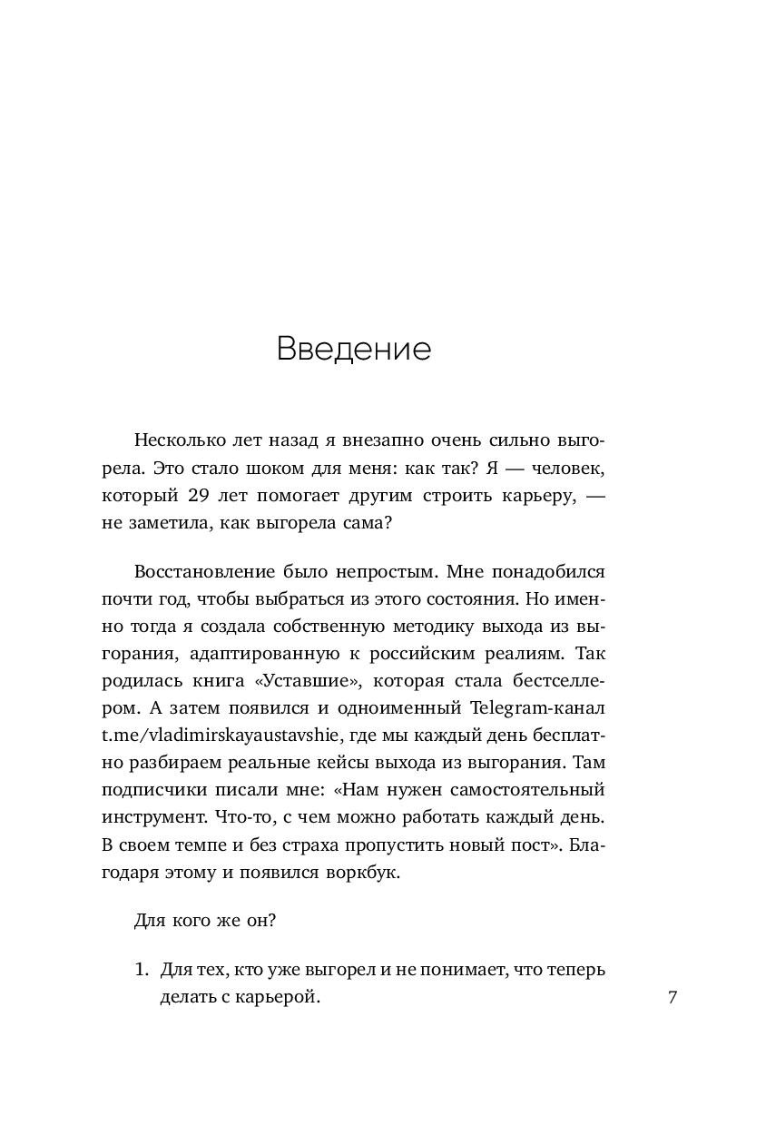 Воркбук "Уставшие" – практическая рабочая тетрадь, которая проведет вас по методике бестселлера "Уставшие" от Алёны Владимирской, ведущего хедхантера Рунета.