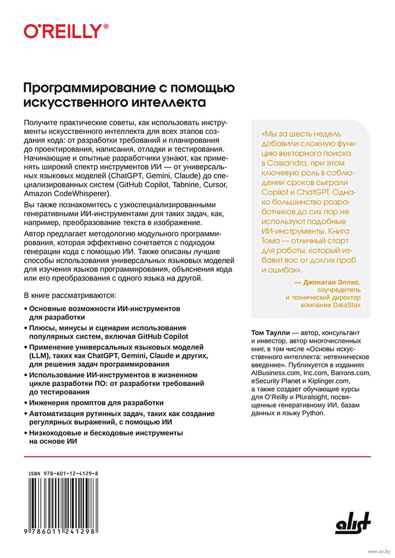 Книга посвящена практике использования инструментов искусственного интеллекта для всех этапов создания кода: от разработки требований и планирования до проектирования, написания, отладки и тестирования. Предложена методология модульного программирования, которая эффективно сочетается с подходом генерации кода с применением ИИ. Рассмотрены основные возможности и сценарии использования инструментов ИИ для разработки, оценены плюсы и минусы популярных систем. Показаны перспективы применения универсальных языковых моделей (LLM), таких как ChatGPT, Gemini, Claude и других, для решения задач программирования. Также рассмотрено применение широкого спектра специализированных систем (GitHub Copilot, Tabnine, Cursor, Amazon CodeWhisperer). Освещены вопросы инженерии промптов, автоматизации рутинных задач, таких как создание регулярных выражений, применения низкокодового и бескодового программирования и др.