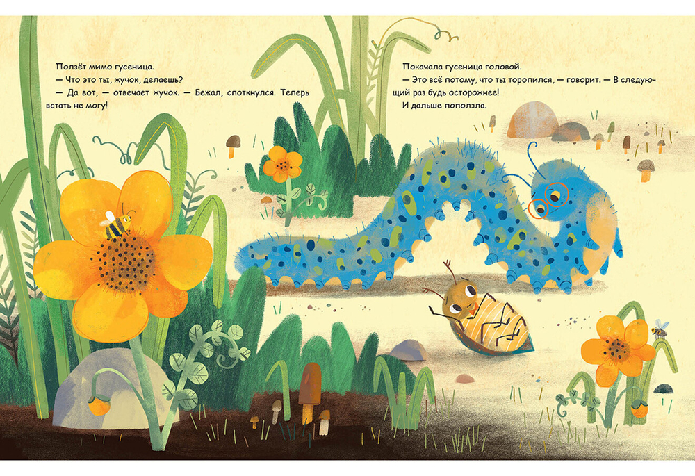 В лесу жил маленький жучок. Бежал он по тропинке, но споткнулся о камень и упал на спинку. Мимо ползли гусеница, паучок и улитка. Они спрашивали жучка, почему он лежит, но никто не помог ему. Жучок изо всех сил пытался подняться и не смог! Вдруг он увидел муравьишку. Жучок приготовился снова отвечать на вопросы, но муравьишка взял веточку и протянул её жучку…