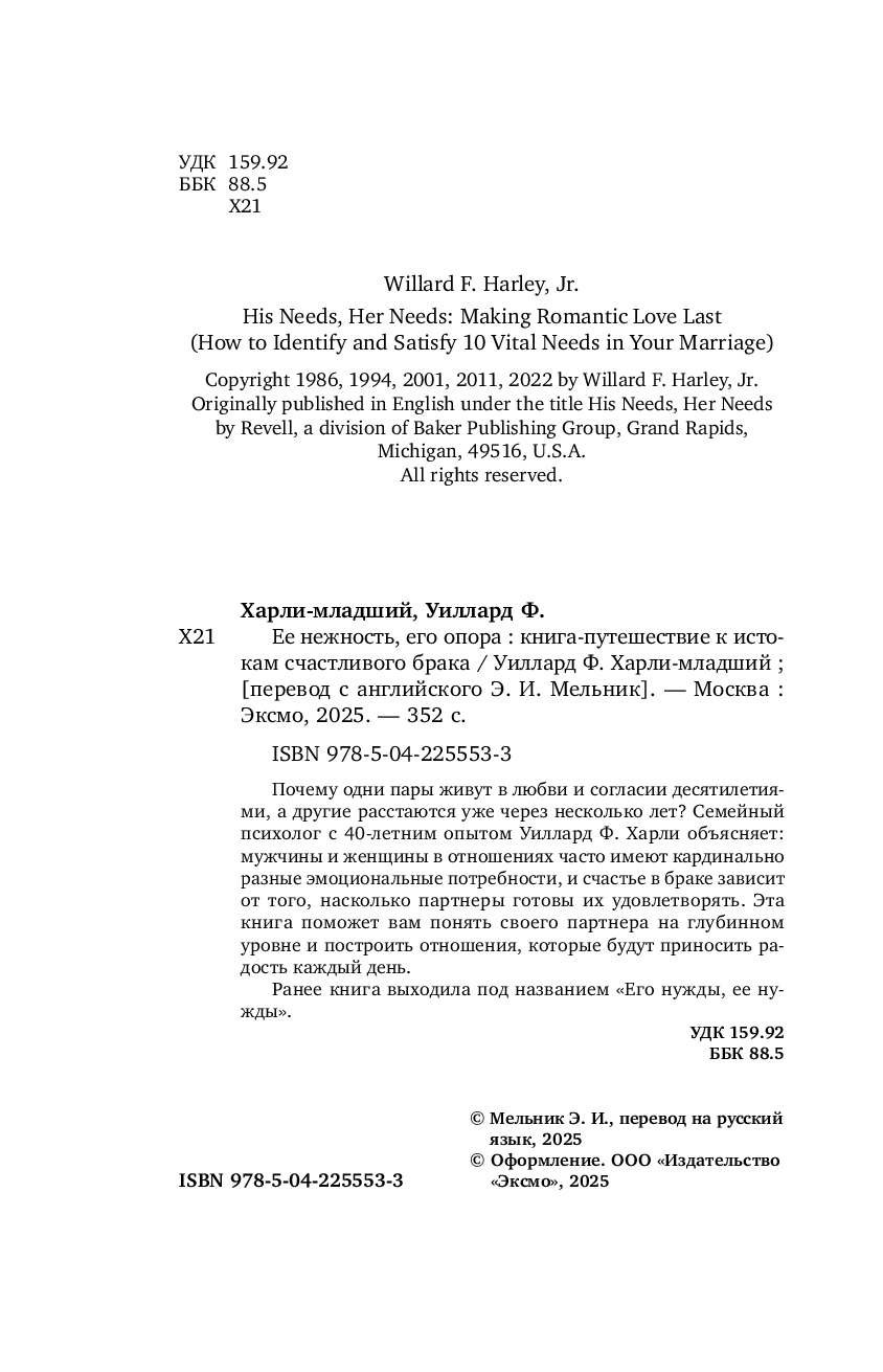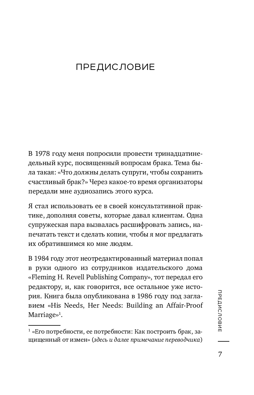 | Название в оригинале | His Needs, Her Needs: Making Romantic Love Last (How to Identify and Satisfy 10 Vital Needs in Your Marriage |