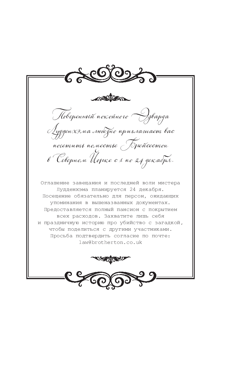 Спустя год после загадочной смерти Эдварда Лудденхэма девять гостей накануне Рождества собираются на оглашение завещания в поместье Брейсестон. Каждый из них привозит с собой не только свою тайну, но и историю, связанную с убийством. Таково было условие покойного. До самого Сочельника, когда будет оглашено завещание, дом наполняется ароматом хвои, треском дров и атмосферой загадки.