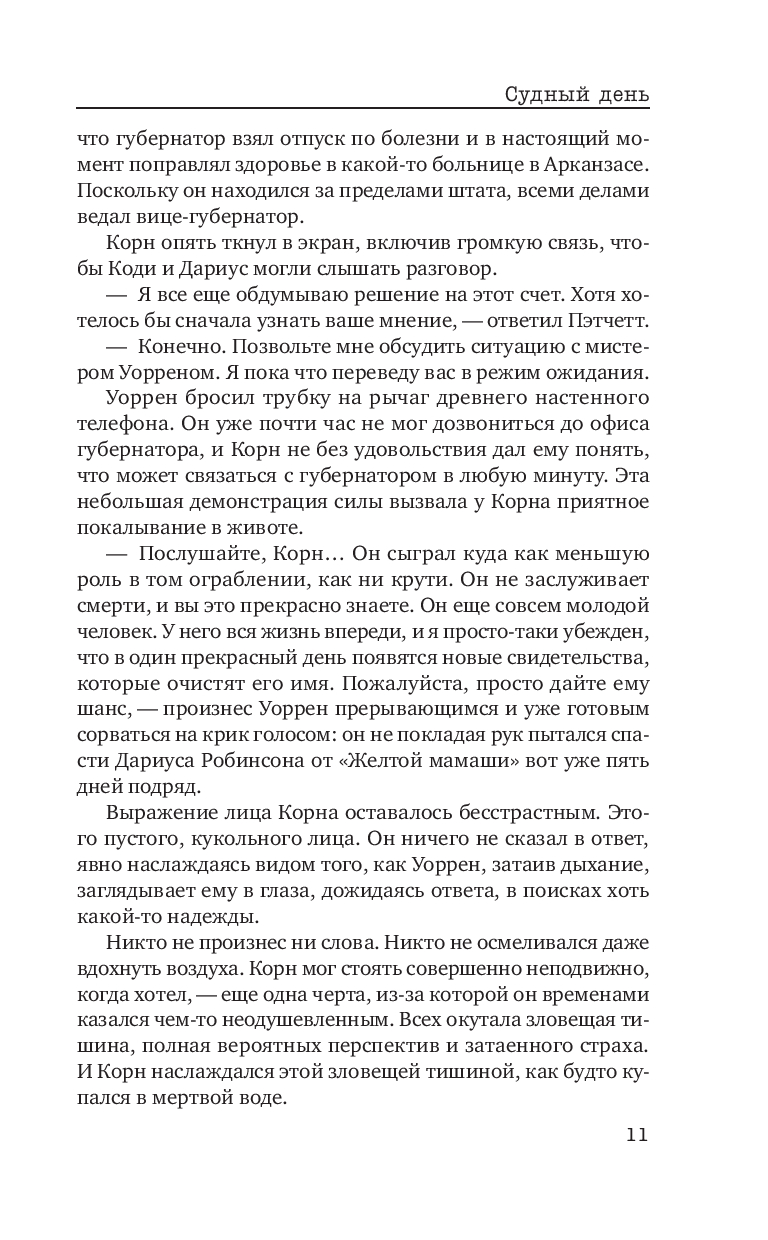 Единственное, чего не учел прокурор, – это вмешательство Эдди Флинна. Тот не верит, что парень – убийца, а значит, сделает все для того, чтобы спасти его. У удачливого нью-йоркского адвоката есть всего семь дней, чтобы спасти невиновного и найти настоящего преступника. Но Корн так просто не сдастся. Козыри у него на руках, а главное – он здесь хозяин и не привык проигрывать…