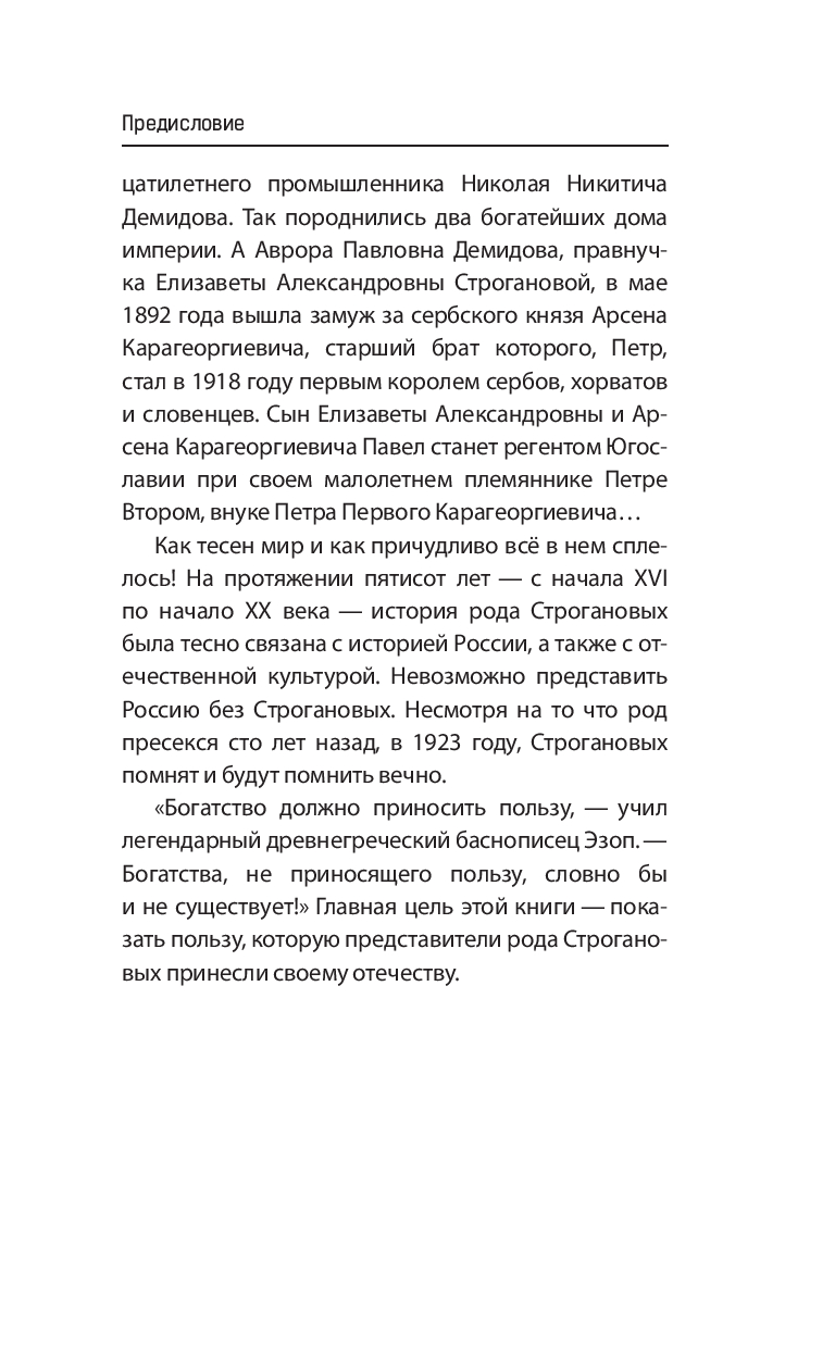 Строгановы – богатые соледобытчики, потом бароны и в конце концов графы… Они породнились с правящим домом Романовых и потомками Рюрика, собрали огромные коллекции произведений искусства и, будучи богатейшими помещиками в империи, потратили баснословные суммы на благотворительность и на помощь своим крепостным крестьянам. Один из представителей рода, Григорий Дмитриевич Строганов, был ближайшим сподвижником и советчиком Петра I, а его внуки и правнуки стали известными министрами, дипломатами и офицерами-героями.