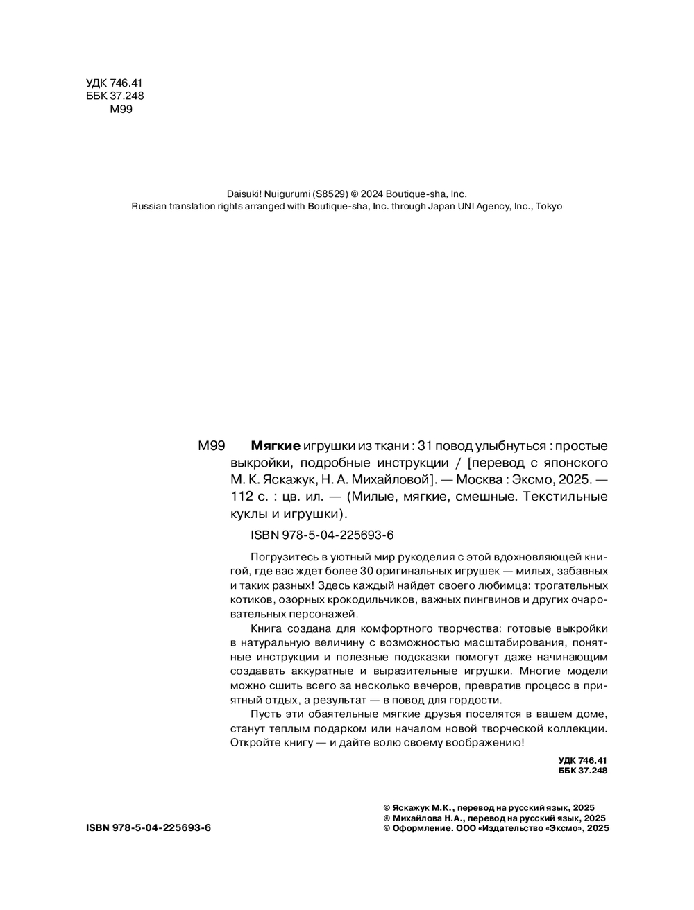 Книга создана для комфортного творчества: готовые выкройки в натуральную величину с возможностью масштабирования, понятные инструкции и полезные подсказки помогут даже начинающим создавать аккуратные и выразительные игрушки. Многие модели можно сшить всего за несколько вечеров, превратив процесс в приятный отдых, а результат – в повод для гордости.