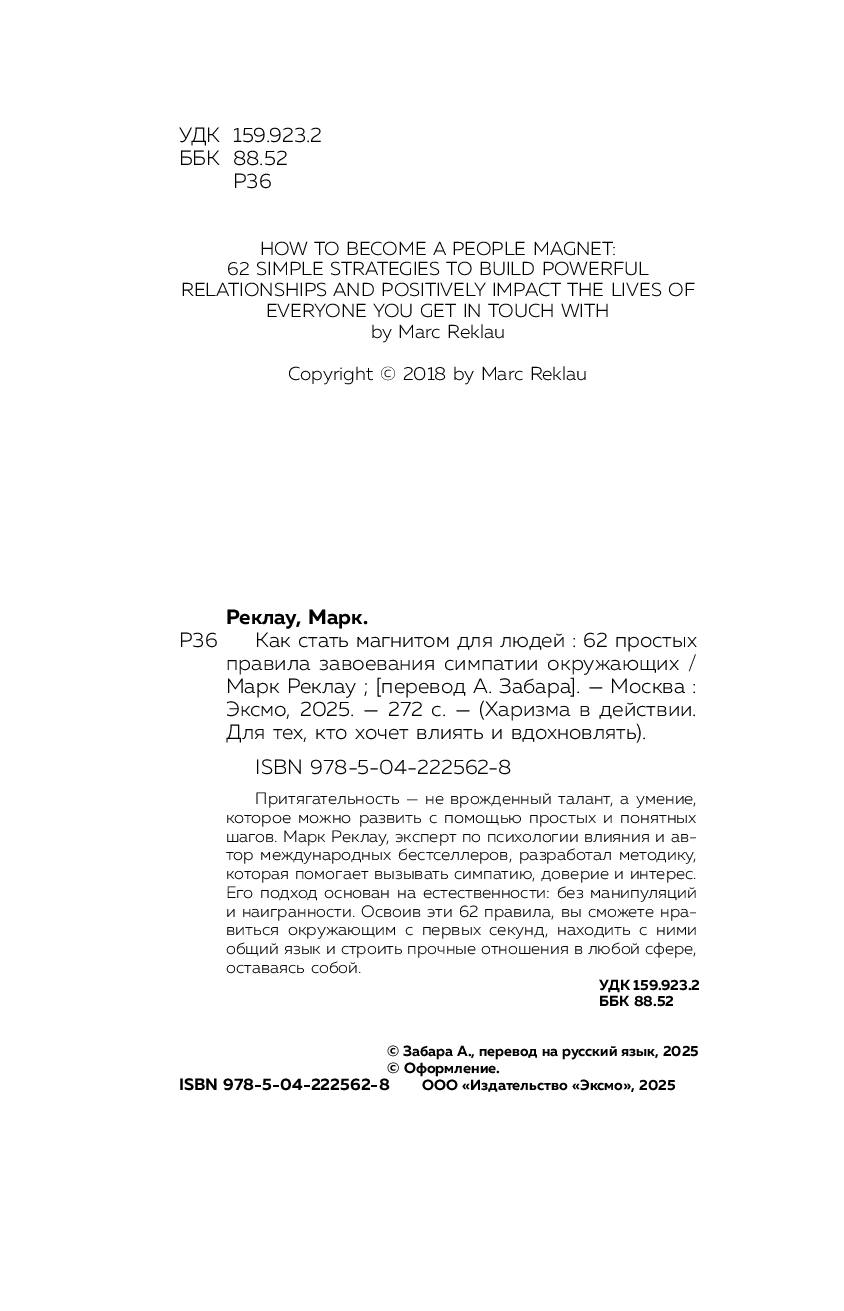 Методика Марка Реклау, эксперта в области психологии влияния и автора бестселлеров по коммуникациям, помогла сотням тысяч людей по всему миру научиться выстраивать прочные отношения через естественную притягательность. Марк не учит манипулировать. Он помогает включить ваш внутренний магнит.