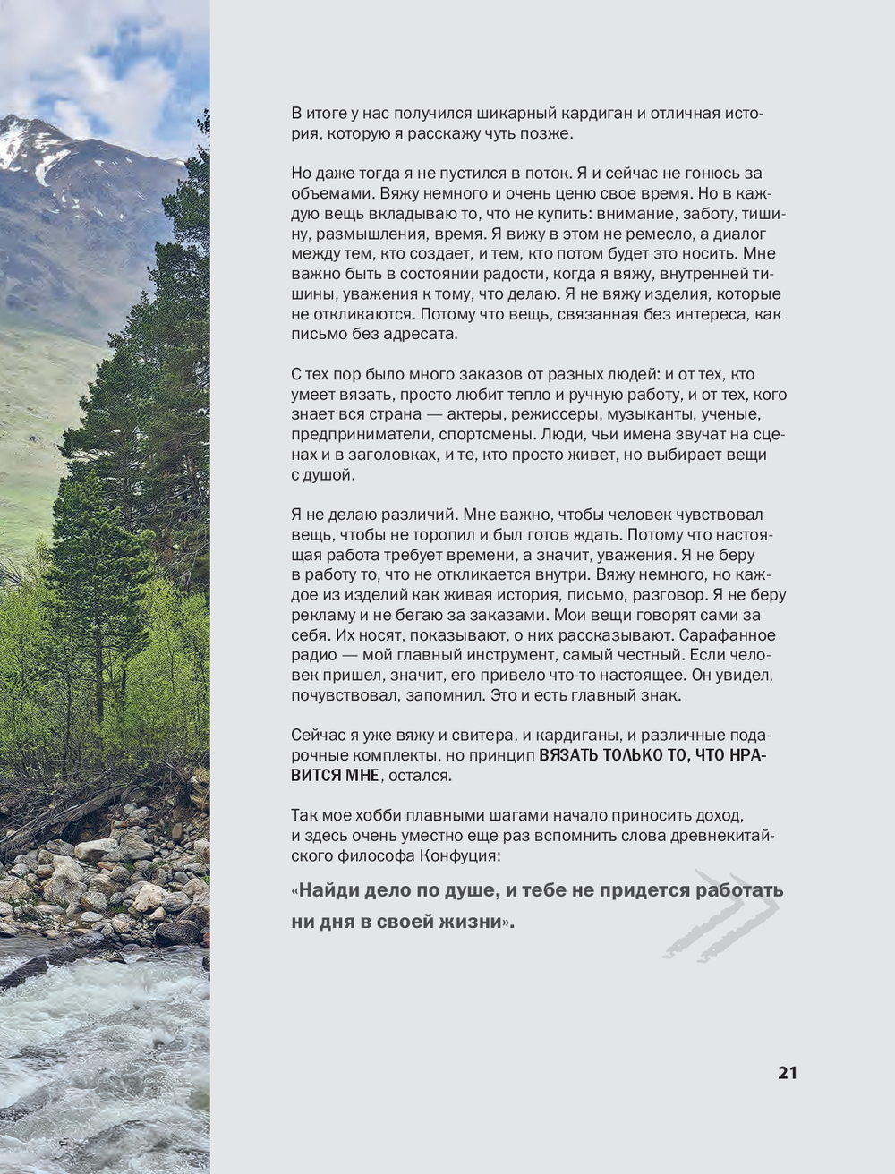 Здесь вы найдете советы по выбору пряжи и цвета, идеи для создания вещей для себя, семьи и друзей, а еще погрузитесь в философию современного вязания как движения, которое объединяет людей разных возрастов и взглядов.