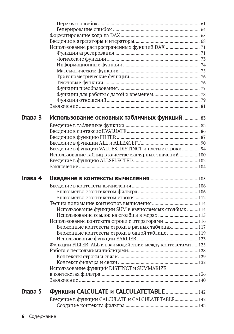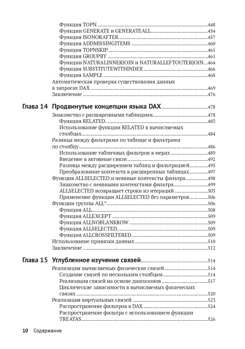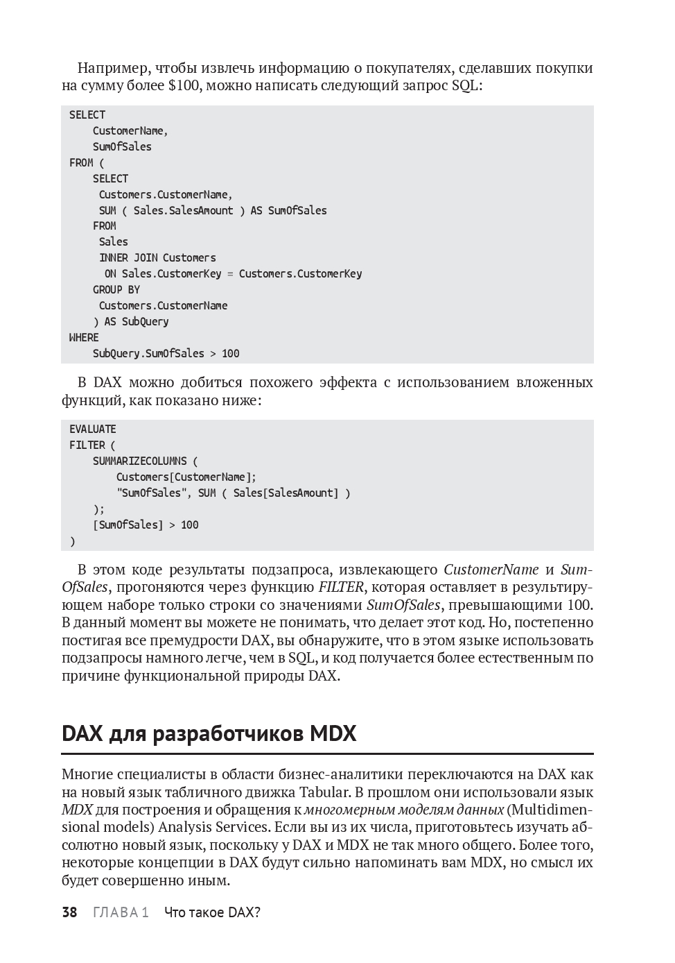 Расширенная и дополненная с учетом современных требований и техник, эта книга представляет собой наиболее полное руководство по языку DAX, применяемому в области бизнес-аналитики, моделирования данных и анализа. Эксперты Microsoft BI Марко Руссо и Альберто Феррари излагают как основы, так и отдельные нюансы работы с DAX: от простых табличных функций до продвинутых техник программирования и оптимизации моделей. Вы узнаете, что происходит под капотом движка DAX при запуске выражений; полученные знания пригодятся при написании быстрого и надежного кода.