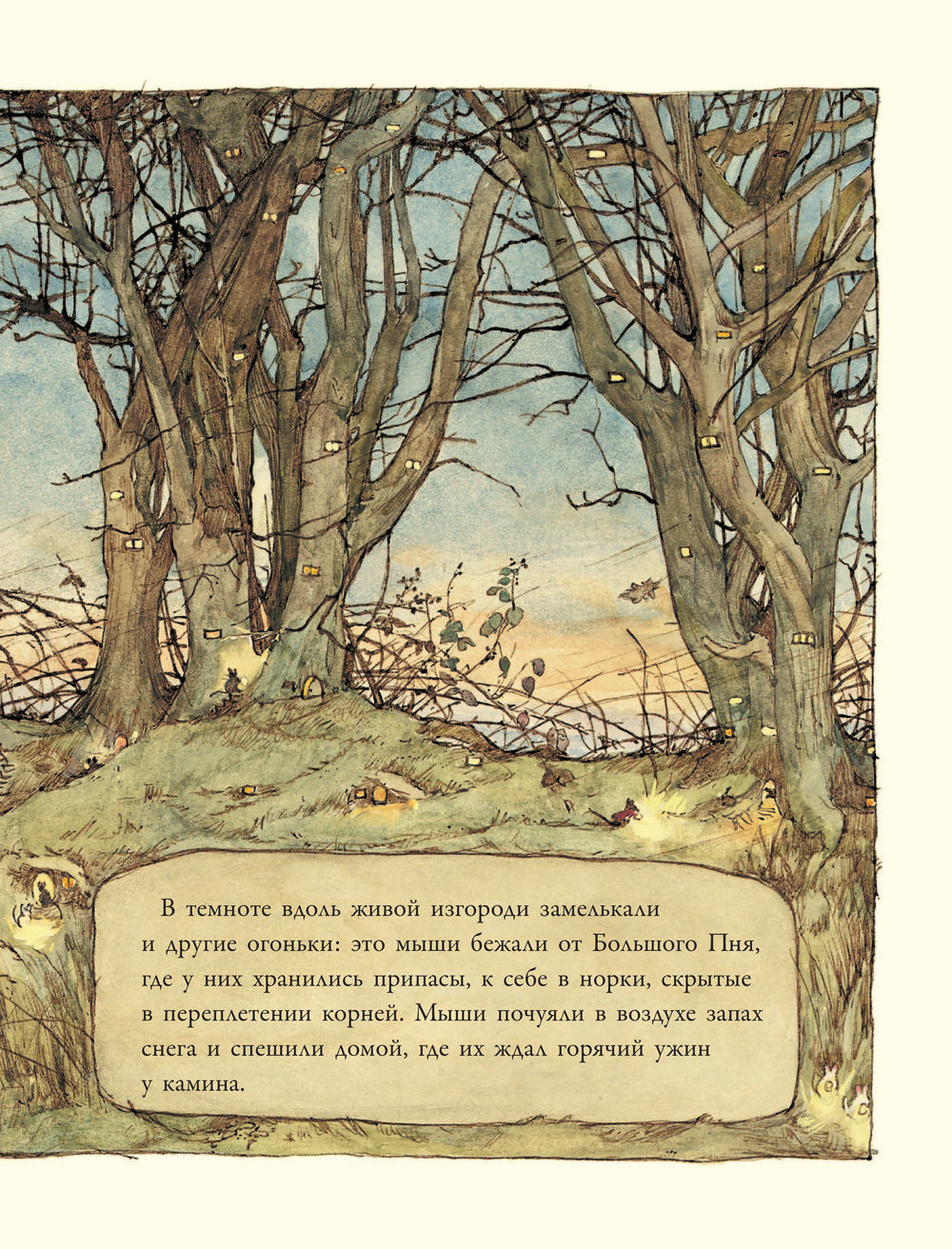 В середине зимы на Ежевичной поляне стояли сильные морозы. Каждый день мыши обсуждали между собой, что вот-вот пойдёт снег. И они оказались правы. Утром маленькие жители обнаружили, что окошки и двери их домиков скрылись под глубокими сугробами. Самое время устроить Снежный Бал!