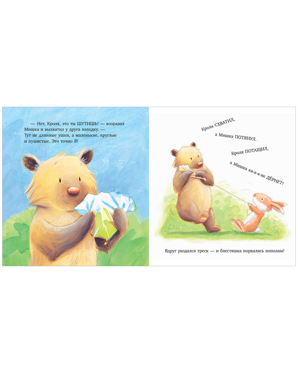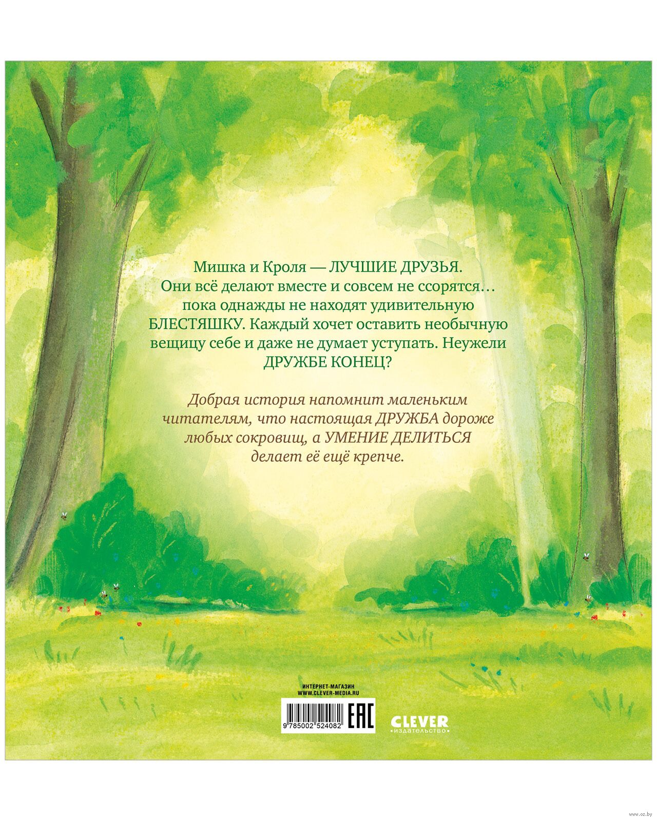 Мишка и Кроля – лучшие друзья. Они все делают вместе и совсем не ссорятся… Пока однажды не находят удивительную блестяшку. Каждый хочет оставить необычную вещицу себе и даже не думает уступать. Неужели дружбе конец? Добрая история книги для малышей напомнит маленьким читателям, что настоящая дружба дороже любых сокровищ, а умение делиться делает ее еще крепче.