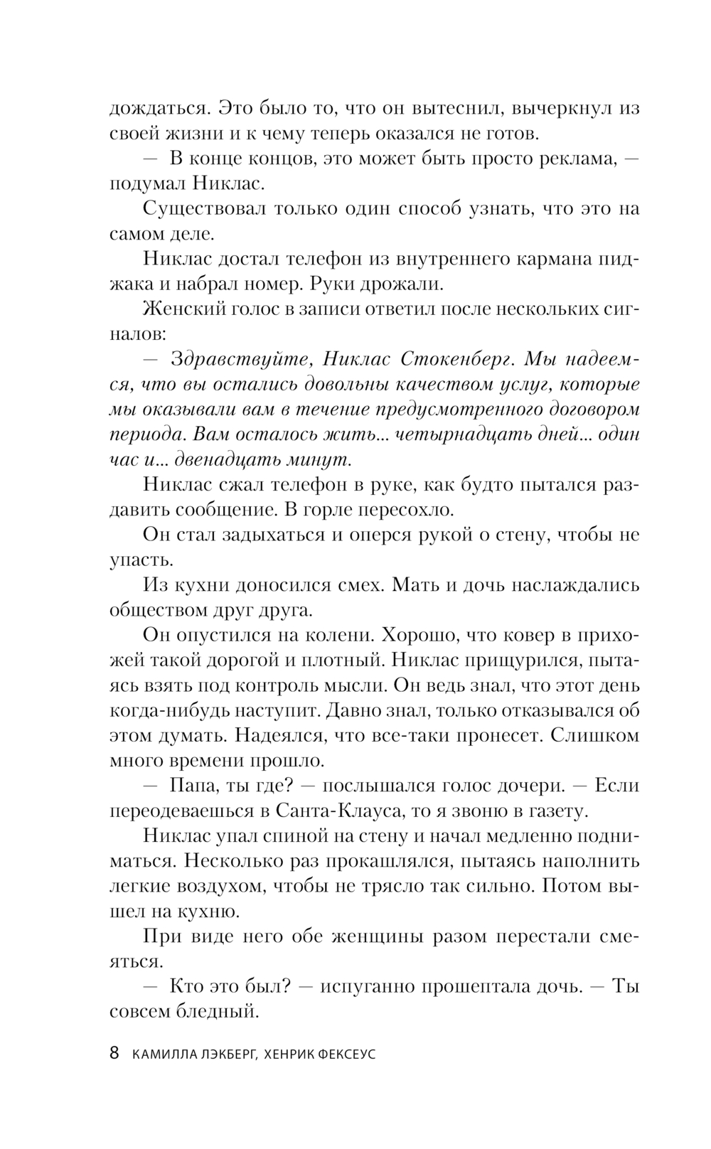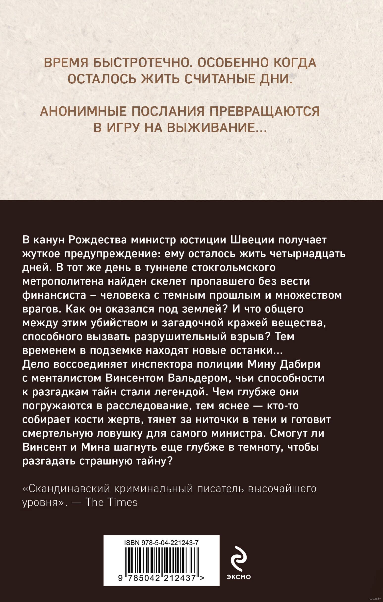 В канун Рождества министр юстиции Швеции получает жуткое предупреждение: ему осталось жить четырнадцать дней. В тот же день в туннеле стокгольмского метрополитена найден скелет пропавшего без вести финансиста – человека с темным прошлым и множеством врагов. Как он оказался под землей? И что общего между этим убийством и загадочной кражей вещества, способного вызвать разрушительный взрыв? Тем временем в подземке находят новые останки…