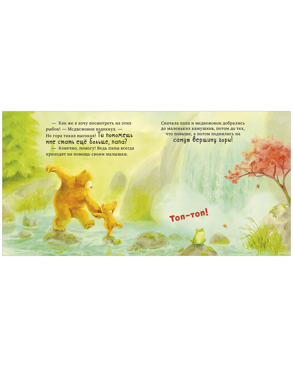 У маленького медвежонка самый лучший папа – сильный, смелый и заботливый. Однажды они отправляются в путешествие: малыш мечтает вырасти и исследовать мир вокруг. Как же поможет ему папа?