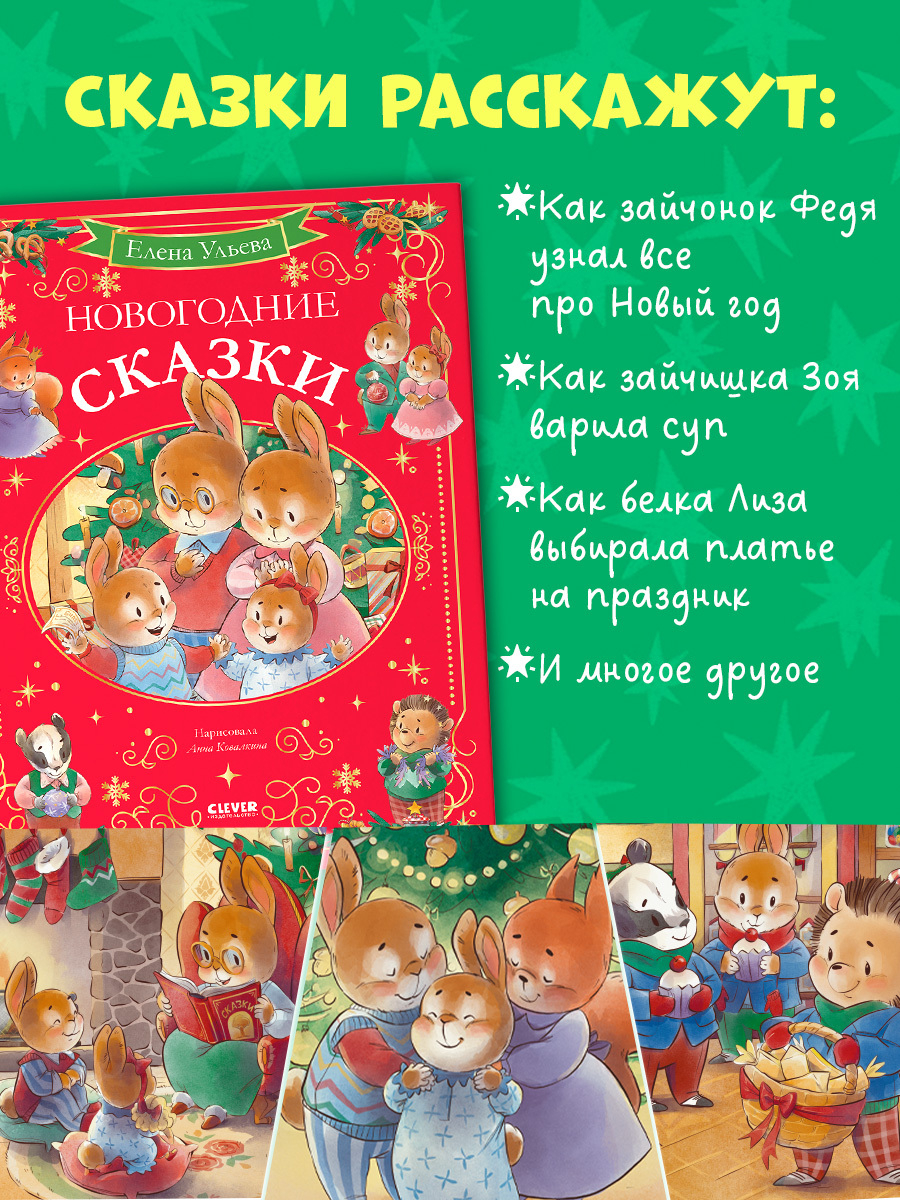 Открывайте "Новогодние сказки", сказки для малышей, и отправляйтесь в гости к жителям лесного городка. Из этой книги для детей вы узнаете, как зайчонок Федя выяснил все про Новый год и Деда Мороза, как белка Лиза выбирала платье для праздника, как зайчишка Зоя варила суп, что загадал маленький мышонок Тимошка и как Федя и барсучок Рома спасли весь город. На страницах книги для малышей вы найдете и другие волшебные истории с красивыми иллюстрациями.