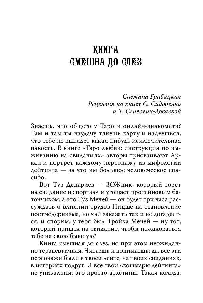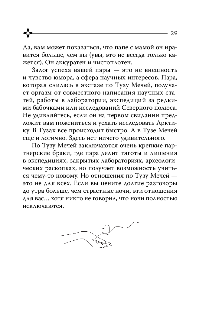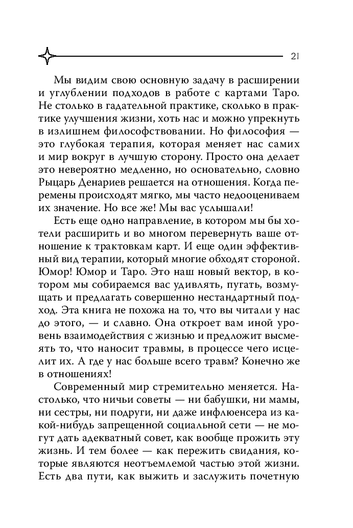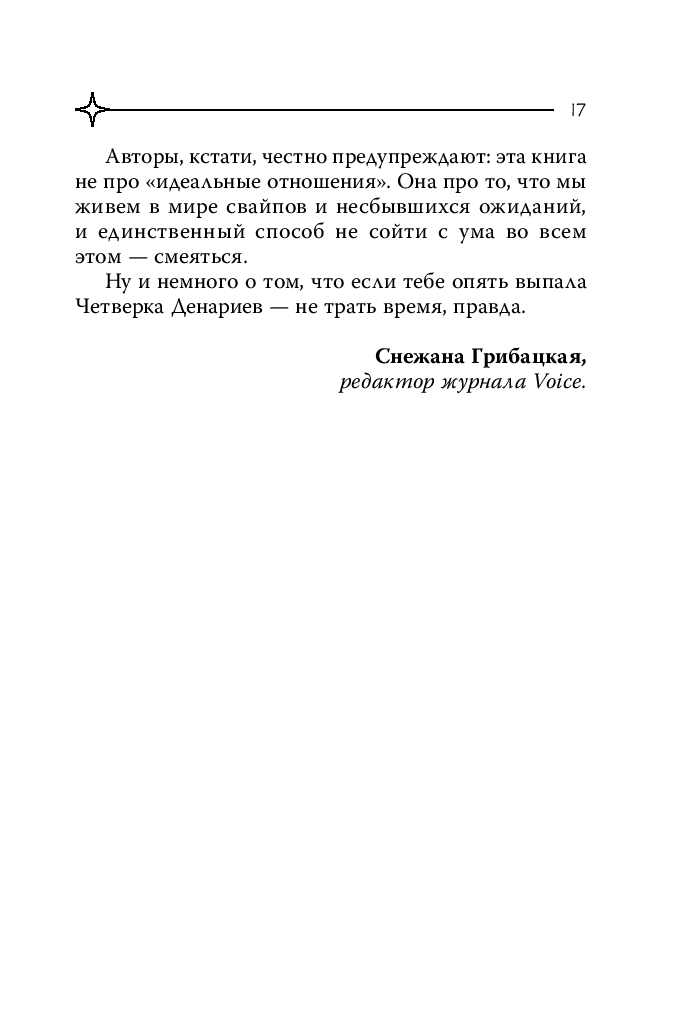 Книга для тех, кто готов с юмором и иронией воспринимать абсурдные ситуации из жизни, включая комичные и порой нелепые моменты построения отношений. Прочитав эту книгу, вы хорошо проведете время и получите ценное откровение – поймете, почему "тот самый" пока не найден. Все просто: если хотите встретить Короля Пентаклей, станьте Королевой Пентаклей. Взгляните на любовь свежим взглядом, поймите себя, примите жизнь с улыбкой, и все сложится.