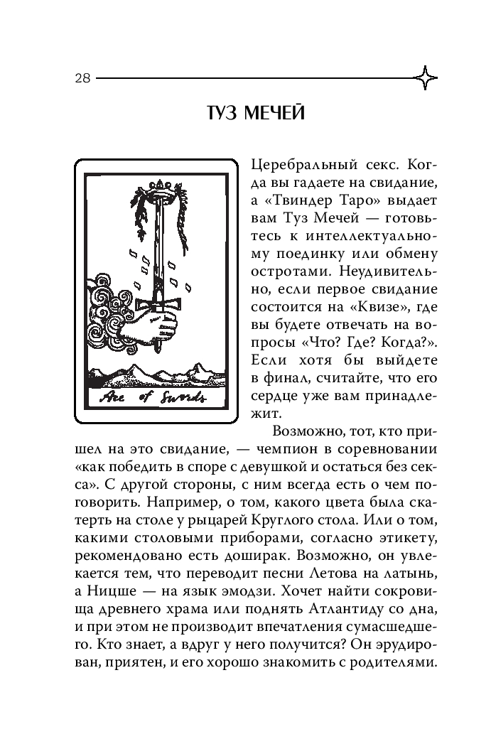 Эта книга – как лучшая подруга, которая знает все про карты Таро, запутанные ситуации и странную мужскую логику. Почему Паж Мечей – пикапер-неудачник, а Девятка Жезлов будет подозревать, что вы хотите поесть за его счет?