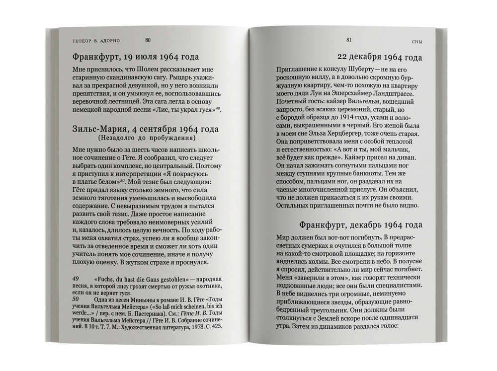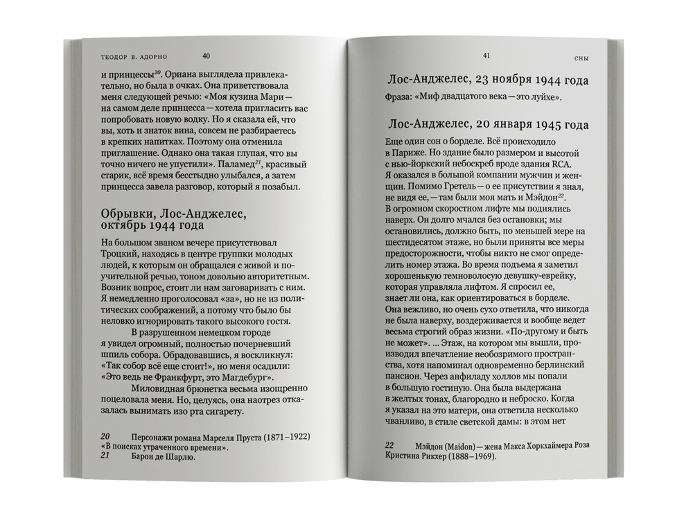 Адорно не толкует свои сны, только иногда замечает: "Тут есть чем поживиться аналитику", – он бесстрашно предоставляет читателю право самому интерпретировать откровенные, порой смешные, порой жуткие, но неизменно яркие образы из своего под сознания. На русском языке издается впервые.