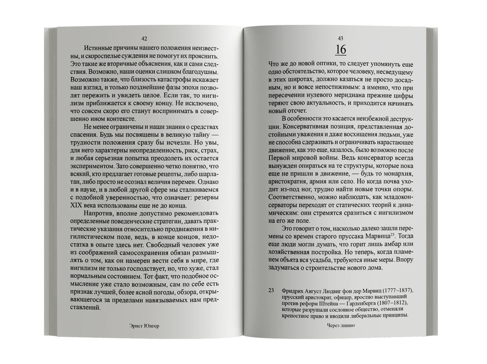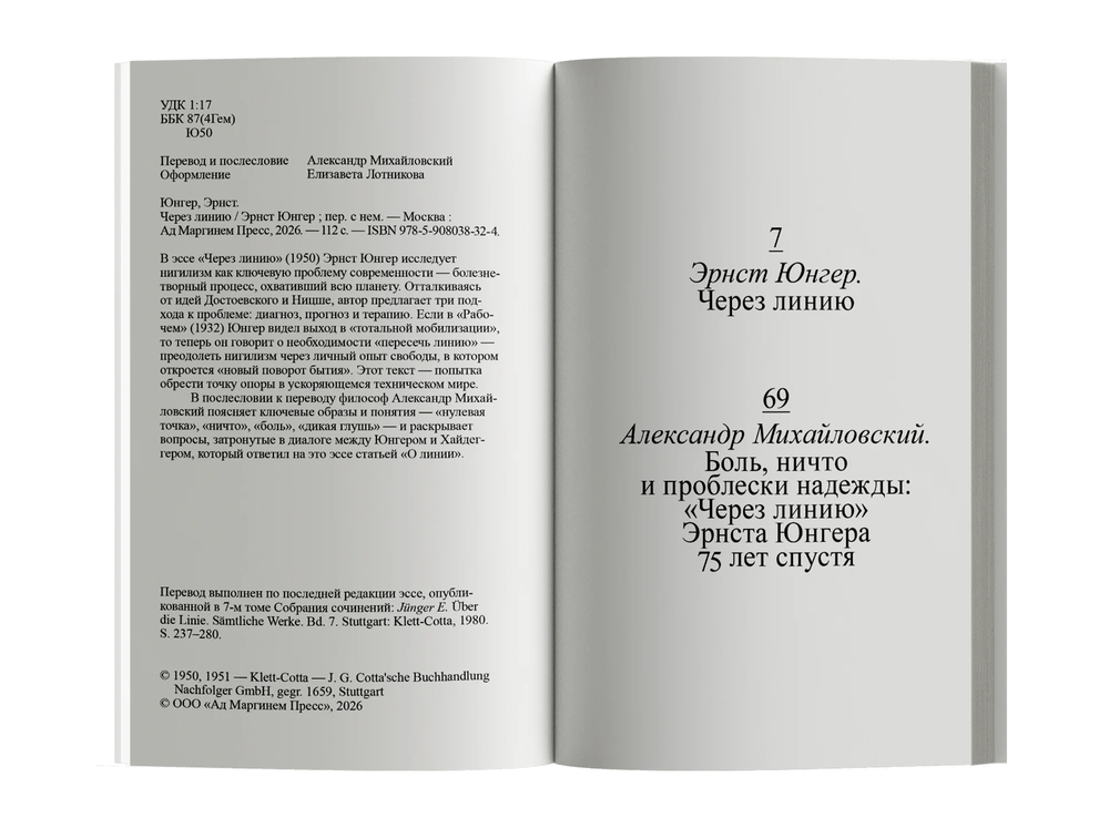 В эссе "Через линию" (1950) Эрнст Юнгер исследует нигилизм как ключевую проблему современности – болезнетворный процесс, охвативший всю планету. Отталкиваясь от идей Достоевского и Ницше, автор предлагает три подхода к проблеме: диагноз, прогноз и терапию. Если в "Рабочем" (1932) Юнгер видел выход в "тотальной мобилизации", то теперь он говорит о необходимости "пересечь линию" – преодолеть нигилизм через личный опыт свободы, в котором откроется "новый поворот бытия". Этот текст – попытка обрести точку опоры в ускоряющемся техническом мире.