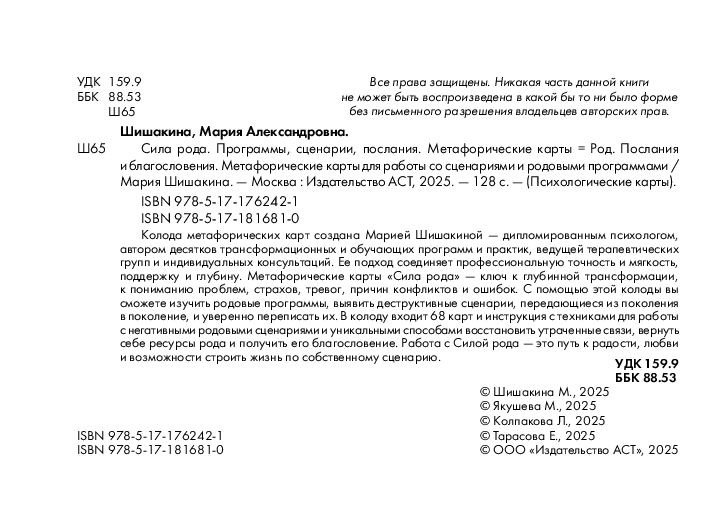 В наборе – 68 эмоциональных, максимально честных к вашему подсознанию карт, наполненных образами, и брошюра-инструкция с авторскими методиками для раскрытия родовой памяти, переписывания деструктивных сценариев и формирования новых моделей, ведущих к счастью и внутренней целостности.