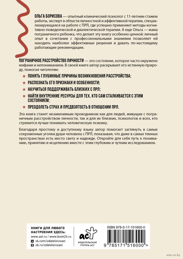 Эта книга станет незаменимым проводником как для людей, живущих с пограничным расстройством личности, так и для их близких, психологов и всех, кто стремится лучше понимать человеческую психику. Благодаря простому и доступному языку, автор помогает заглянуть в самые сокровенные уголки души человека с ПРЛ, показывая, что даже в самых тёмных пространствах есть место свету и надежде. Откройте для себя путь к пониманию, принятию и исцелению вместе с этим глубоким и чутким исследованием.