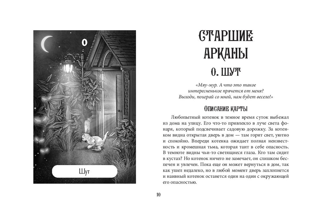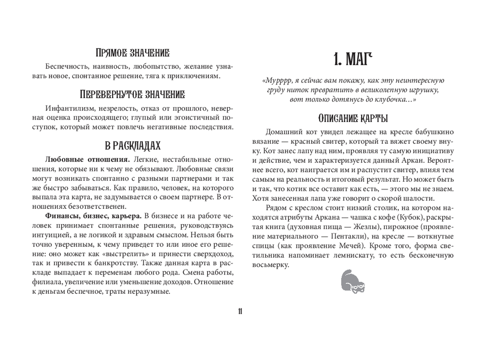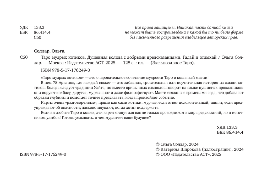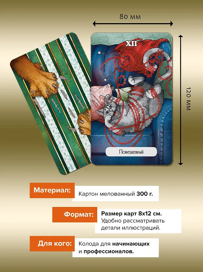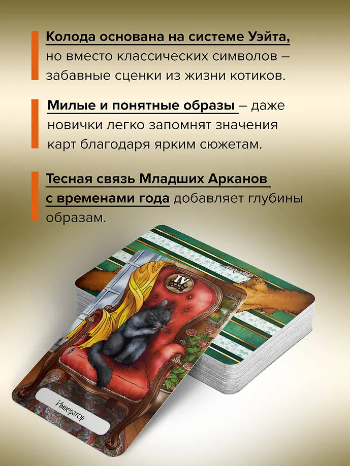 Автор Ольга Соллар и художница Екатерина Широкова создали уникальное Таро, где каждый Аркан оживает в образах озорных, мудрых и трогательных котиков. Колода основана на системе Уэйта, но вместо классических символов – забавные сценки из жизни котов: они охотятся за солнечными зайчиками, воруют колбасу, дерутся за территорию или сладко спят, свернувшись калачиком.
