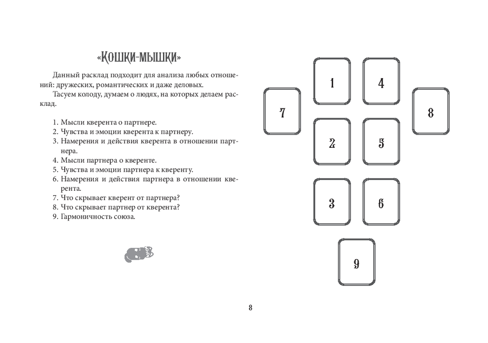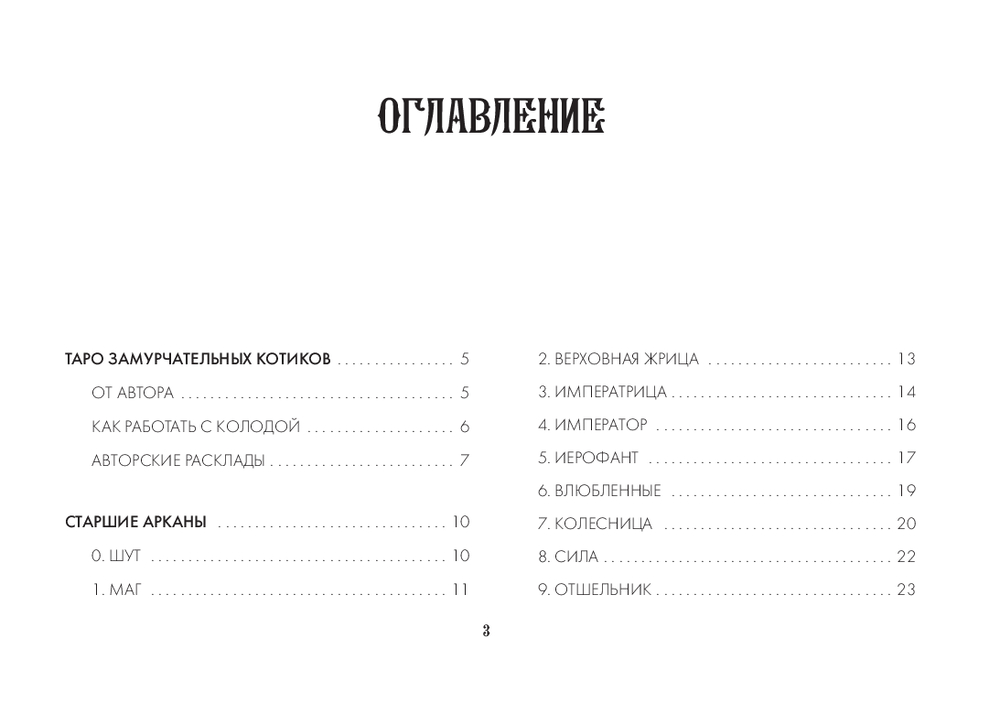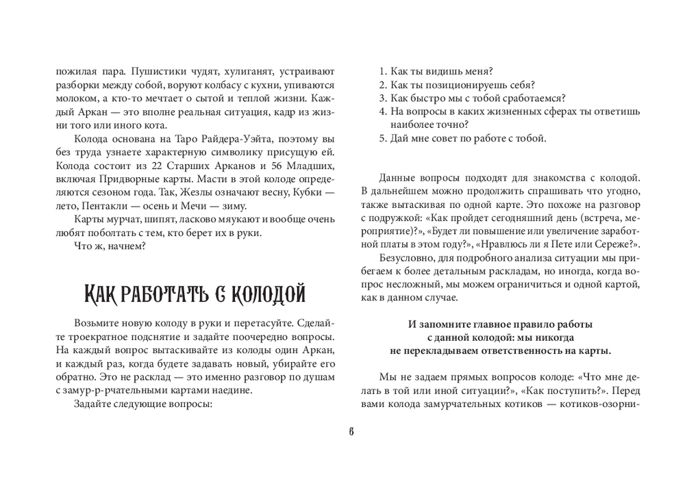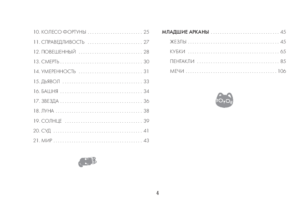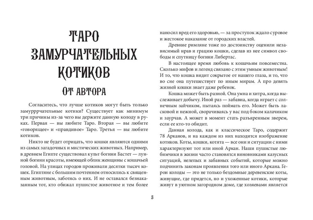 Автор Ольга Соллар и художница Екатерина Широкова создали уникальное Таро, где каждый Аркан оживает в образах озорных, мудрых и трогательных котиков. Колода основана на системе Уэйта, но вместо классических символов – забавные сценки из жизни котов: они охотятся за солнечными зайчиками, воруют колбасу, дерутся за территорию или сладко спят, свернувшись калачиком.