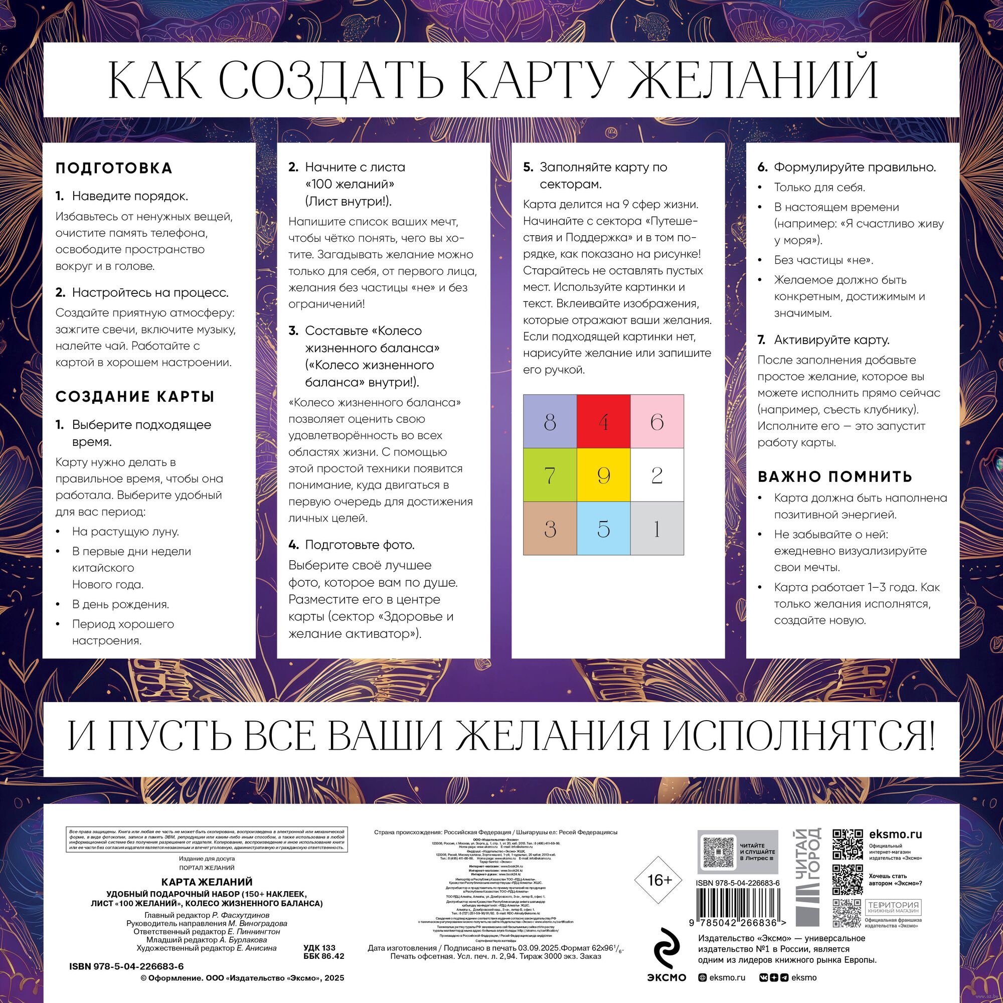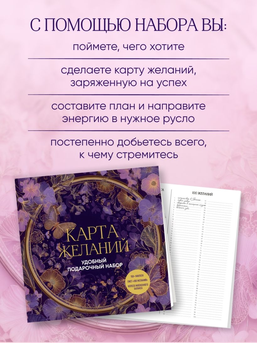 Исполнение желаний – это реальность, если правильно настроить свои цели. Карта желаний и вспомогательные практики в этом наборе помогут вам ясно определить, чего вы хотите в каждой сфере жизни, и направить вашу энергию в нужное русло.