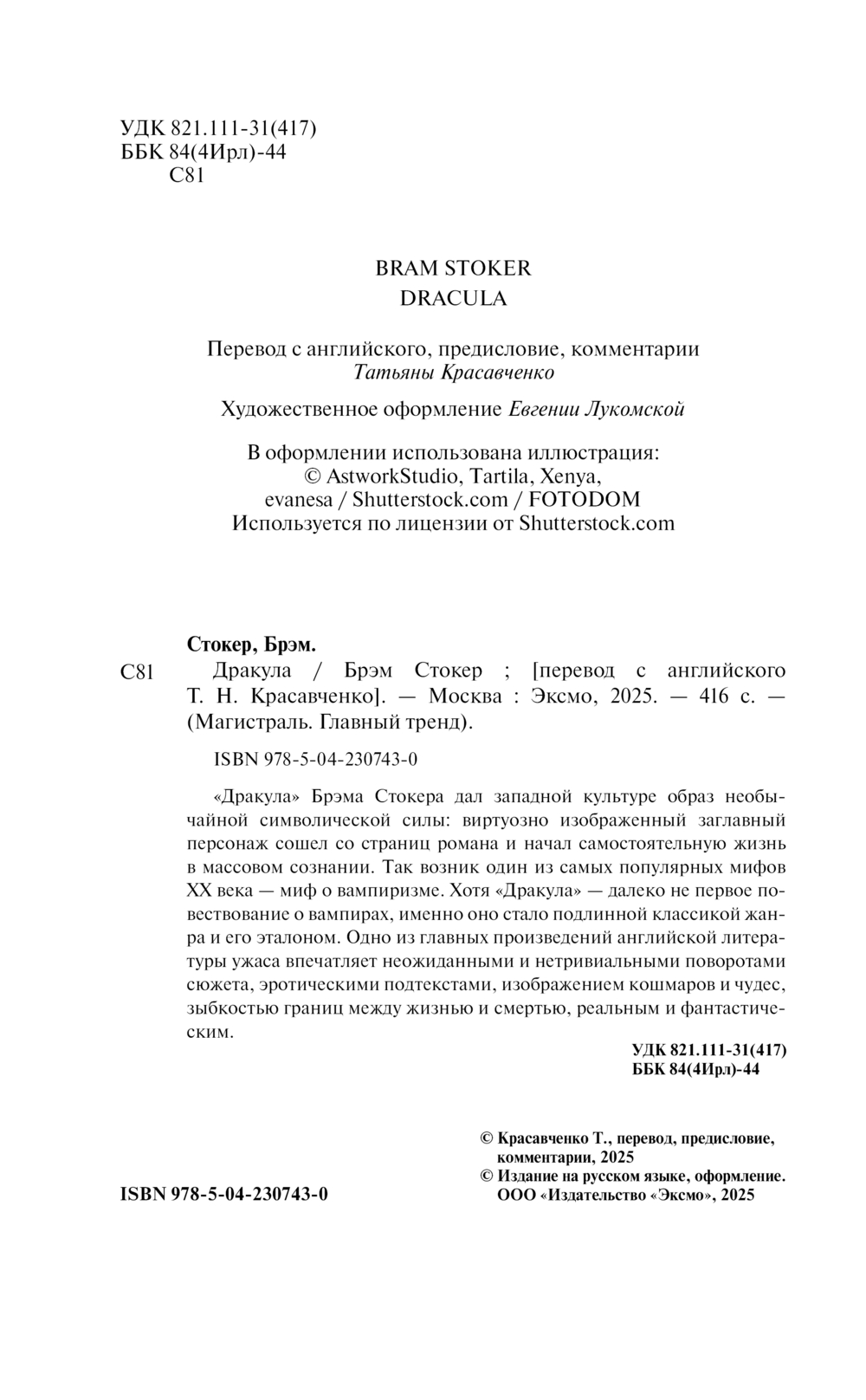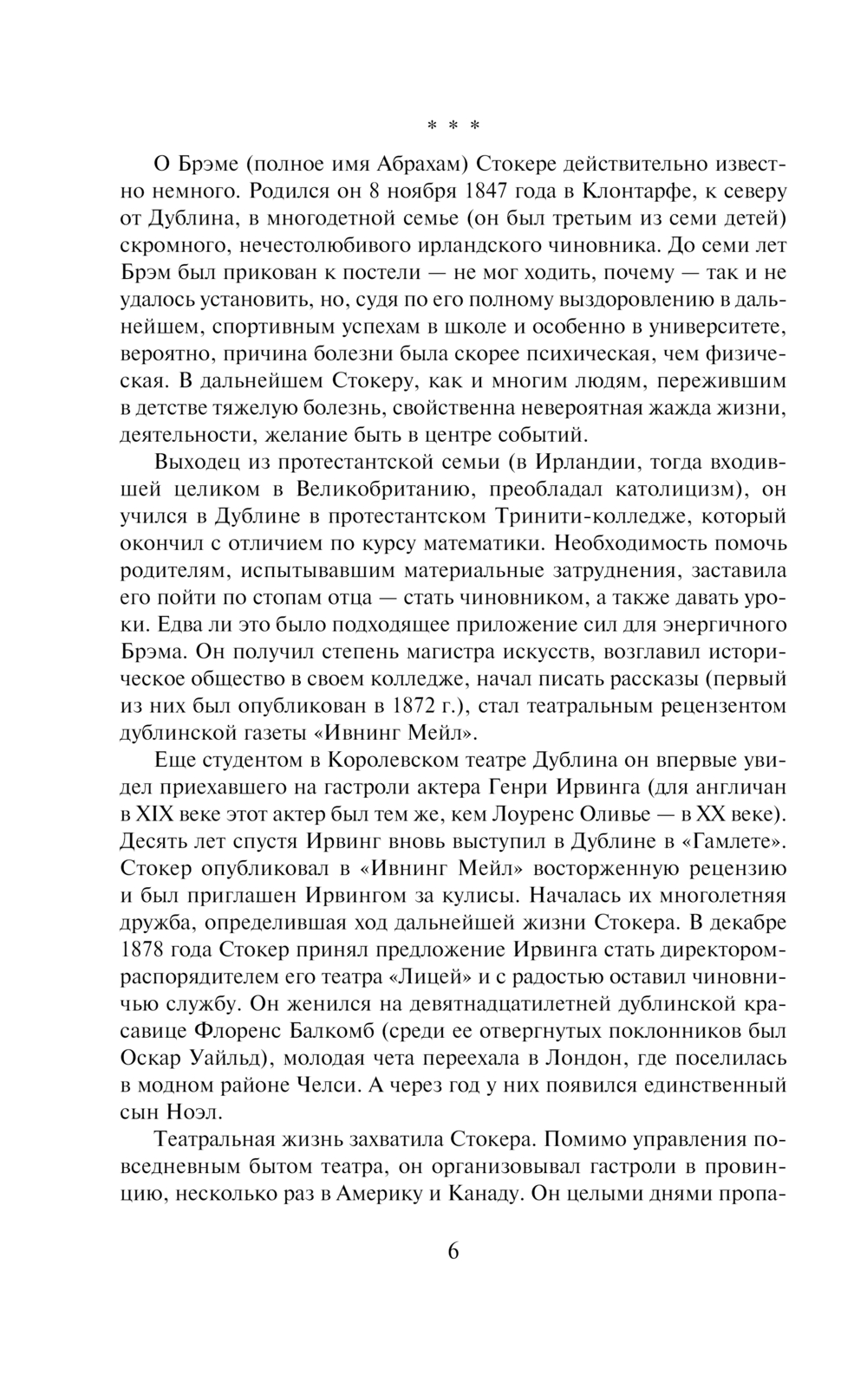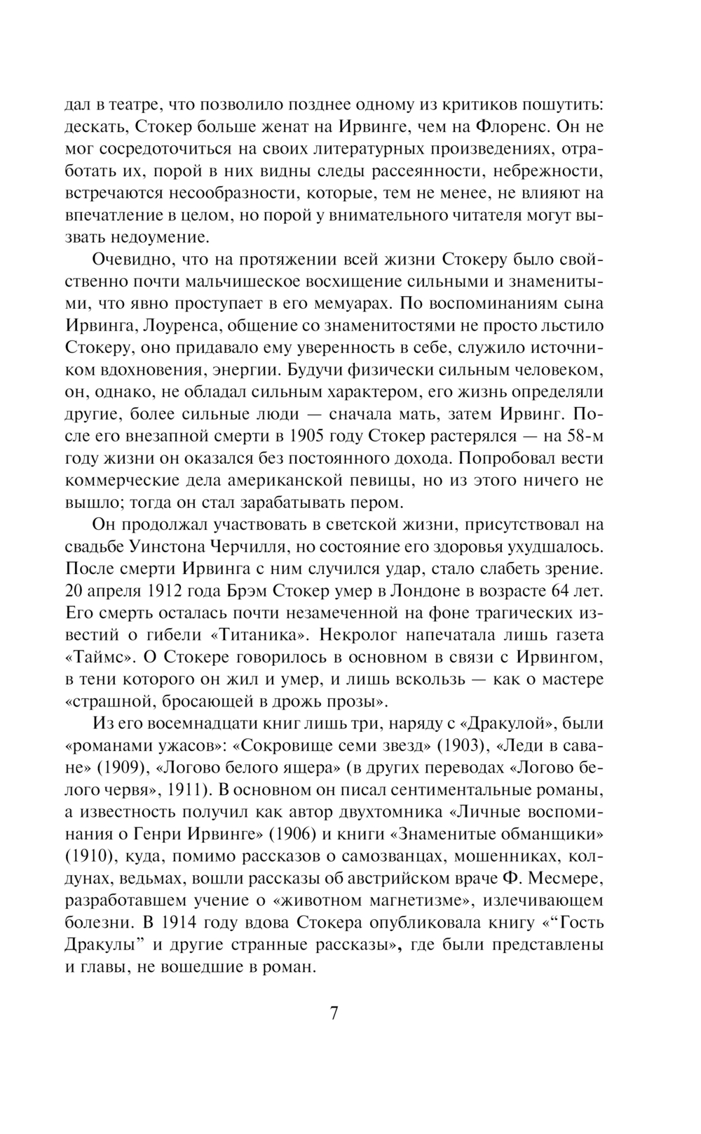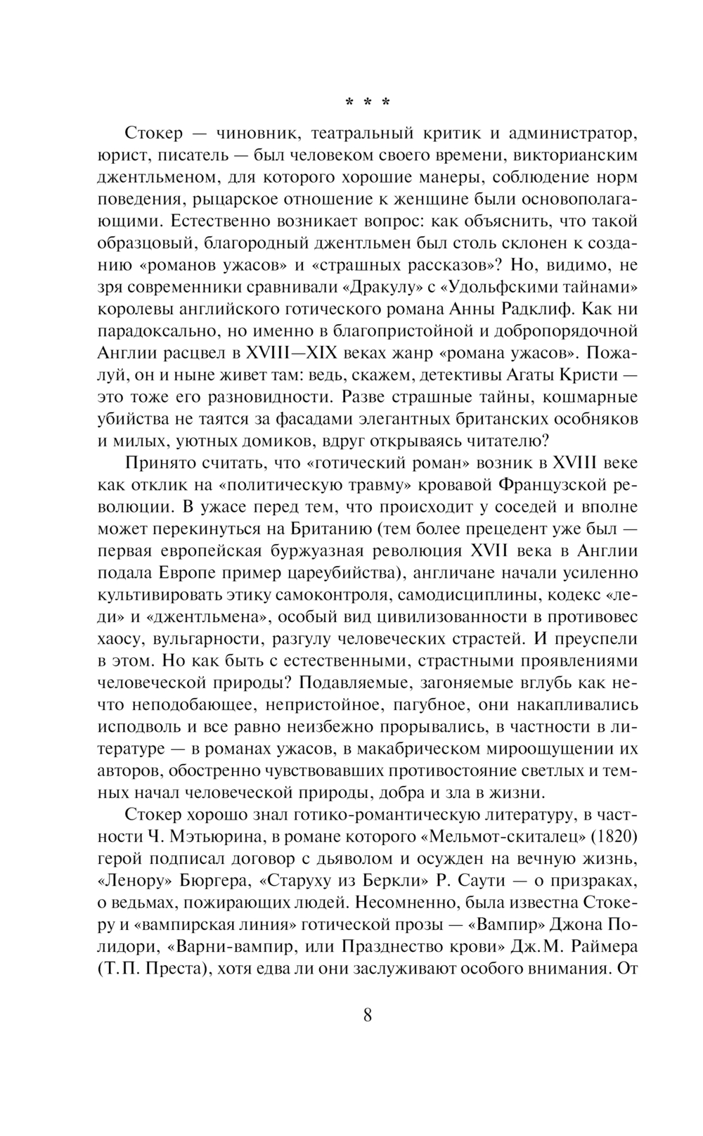 "Дракула" Брэма Стокера дал западной культуре образ необычайной символической силы: виртуозно изображенный заглавный персонаж сошел со страниц романа и начал самостоятельную жизнь в массовом сознании. Так возник один из самых популярных мифов XX века – миф о вампиризме. Хотя "Дракула" – далеко не первое повествование о вампирах, именно оно стало подлинной классикой жанра и его эталоном. Одно из главных произведений английской литературы ужаса впечатляет неожиданными и нетривиальными поворотами сюжета, эротическими подтекстами, изображением кошмаров и чудес, зыбкостью границ между жизнью и смертью, реальным и фантастическим.