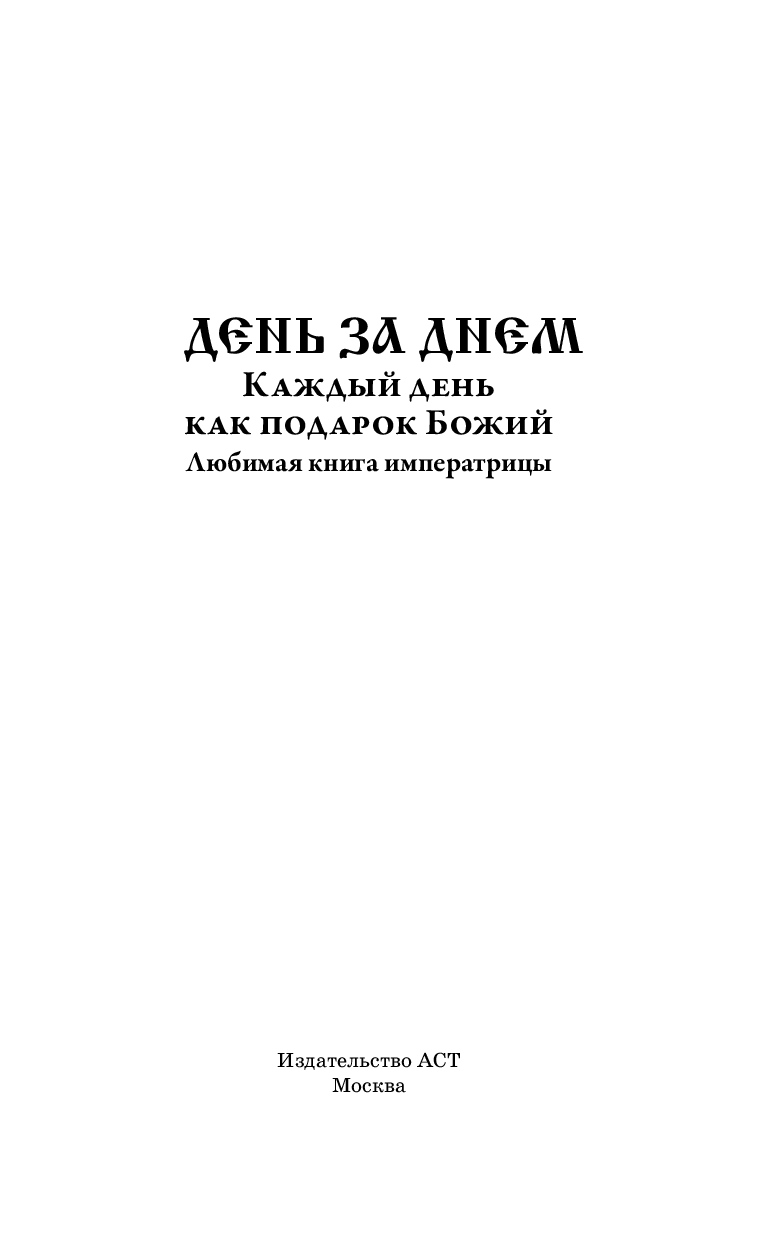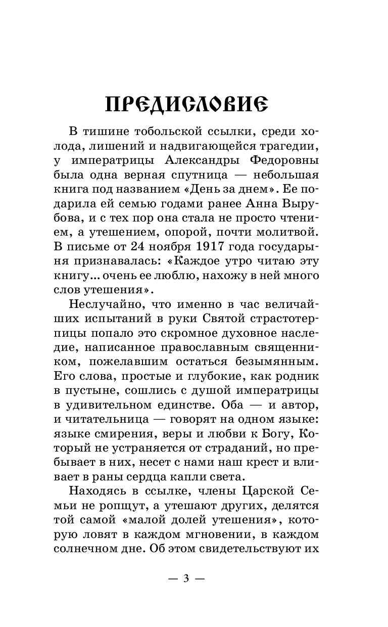 "День за днем. Каждый день как подарок Божий" – небольшая, но глубоко проникновенная книга духовных размышлений, написанная в начале XX века православным священником, пожелавшим остаться безымянным. Ее простые, но исполненные веры и смирения строки стали подлинной опорой для императрицы Александры Федоровны в годы тобольской ссылки и до последних дней.