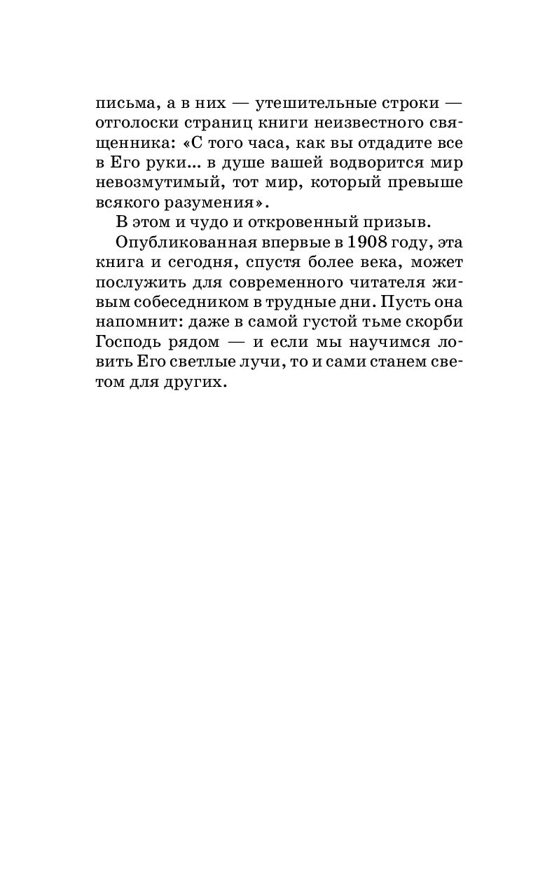 В час величайших испытаний слова неизвестного автора звучали как молитва, как напоминание о том, что Бог не устраняется от страданий, но пребывает в них вместе с нами. Именно этот дух – доверия Промыслу, внутреннего мира и любви к ближнему – пронизывает всё содержание книги и находит отклик в письмах Царской Семьи, не роптавшей даже в невзгодах, а делившейся утешением с окружающими.