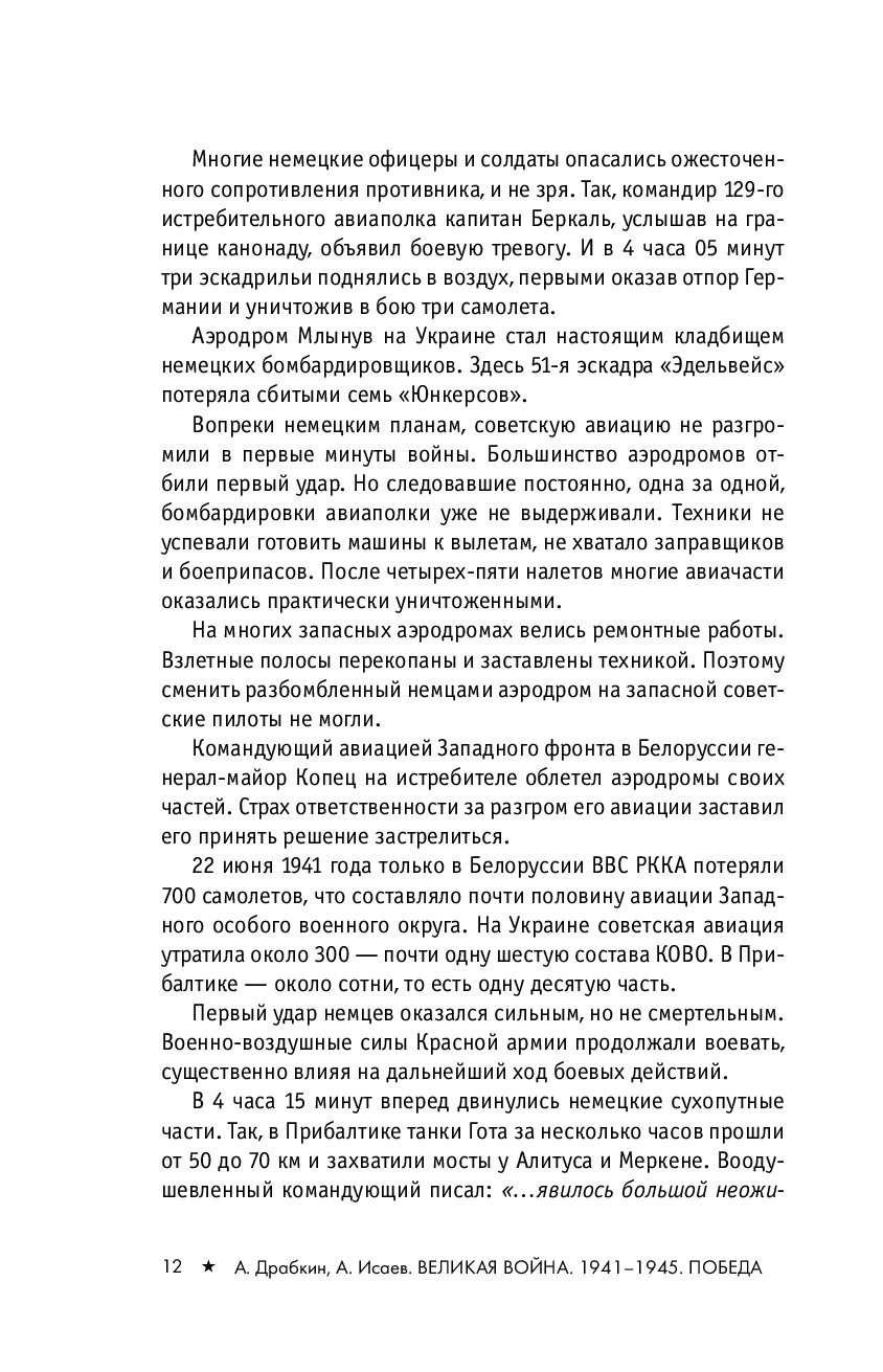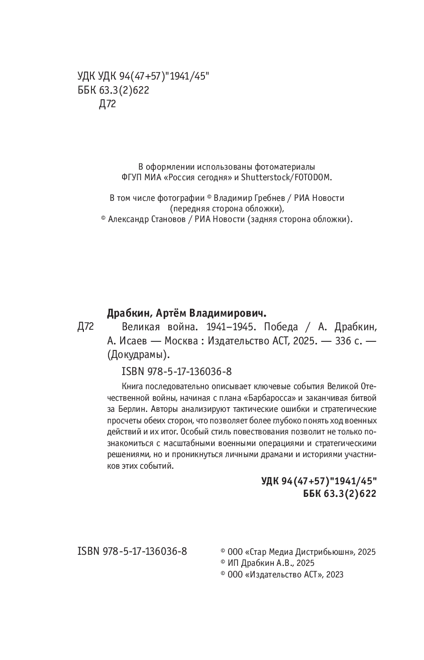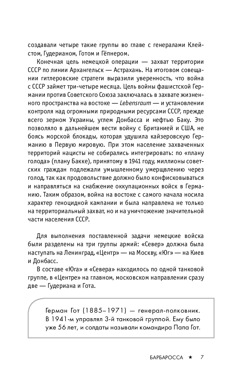 Книга последовательно описывает ключевые события Великой Отечественной войны, начиная с плана "Барбаросса" и заканчивая битвой за Берлин. Авторы анализируют тактические ошибки и стратегические просчеты обеих сторон, что позволяет более глубоко понять ход военных действий и их итог. Особый стиль повествования позволит не только познакомиться с масштабными военными операциями и стратегическими решениями, но и проникнуться личными драмами и историями участников этих событий. Издание станет незаменимым источником знаний для всех, кто хочет глубже понять события 1941–1945 годов, почувствовать дух времени и ещё раз вспомнить о той страшной цене, которую пришлось заплатить за победу.