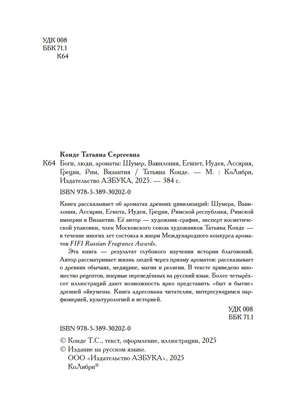 Книга рассказывает об ароматах древних цивилизаций – Шумера, Вавилонии, Ассирии, Египта, Иудеи, Греции, Византии, Римской республики и Римской империи. Её автор – член Московского союза художников Татьяна Конде – в течение многих лет состояла в жюри международного конкурса ароматов "FIFI Russian Fragrance Awards".