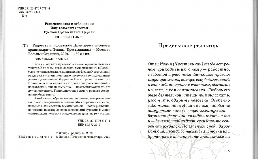 Книга, которую Вы держите в руках, составлена из советов архимандрита Иоанна (Крестьянкина), который был очень радостным, лучистым человеком во всех обстоятельствах своей многоскорбной жизни. Радость эта струилась живым потоком и оживляла души людей, приходивших к батюшке. Пусть эта радость придет к Вам с книжных страниц, отгоняя от души печаль и уныние. "И радости вашей никто не отнимет у вас" (Ин. 16, 22).