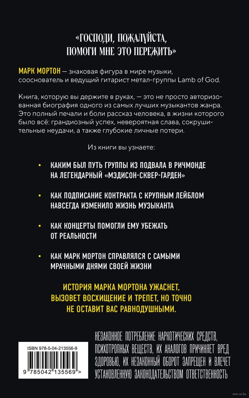 Книга, которую вы держите в руках, – это не просто авторизованная биография одного из самых лучших музыкантов жанра. Это полный печали и боли рассказ человека, в жизни которого было всё: грандиозный успех, невероятная слава, сокрушительные неудачи, а также глубокие личные потери. Каким был путь группы из подвала в Ричмонде на легендарный "Мэдисон-сквер-гарден"? Чья музыка может довести Мортона до слез? Что помогло Марку Мортону справиться с потерей новорождённой дочери? История Марка Мортона ужаснет, вызовет восхищение и трепет, но точно не оставит вас равнодушными.
