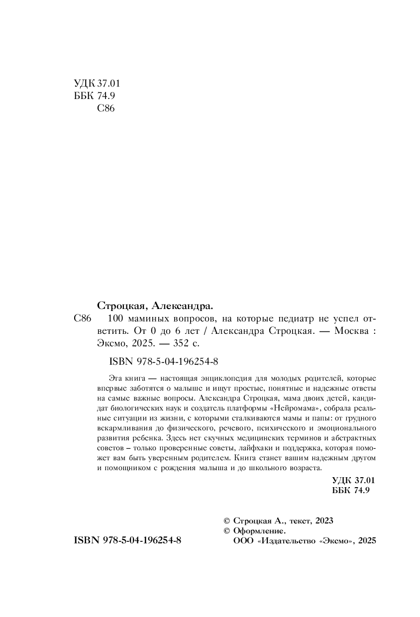 Александра Строцкая, мама двоих детей, кандидат биологических наук и создатель платформы "Нейромама", делится авторской методикой раннего развития ребенка от 0 до 6 лет, основанной на данных нейробиологии, педагогики и психологии. В этой книге собраны 100 самых частых "маминых" вопросов, которые вы хотели, но не успели задать педиатру.