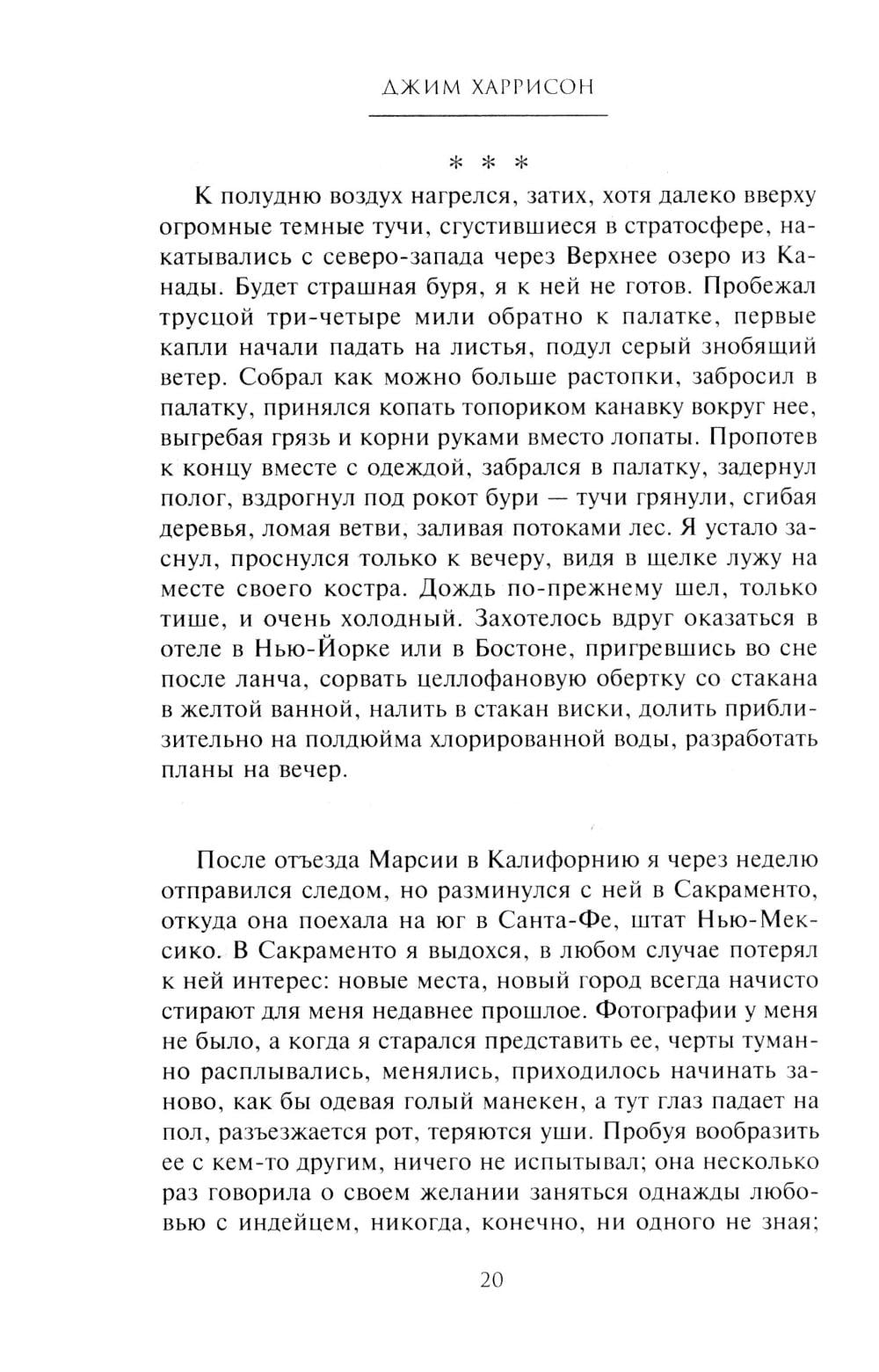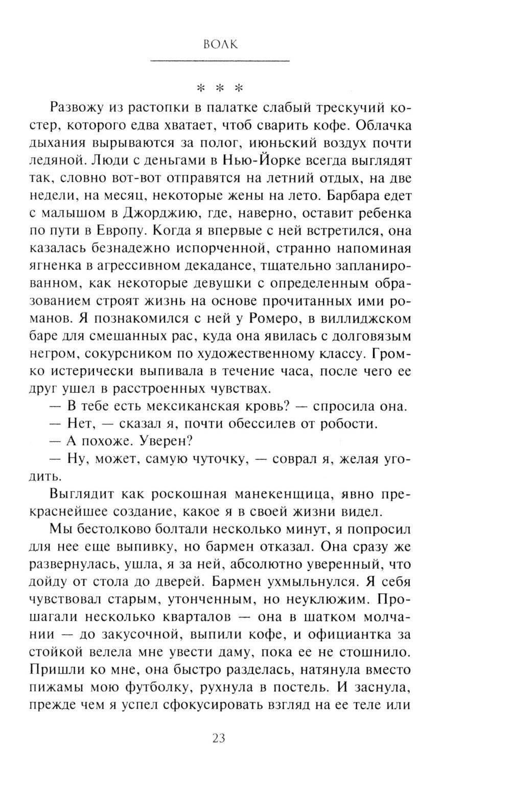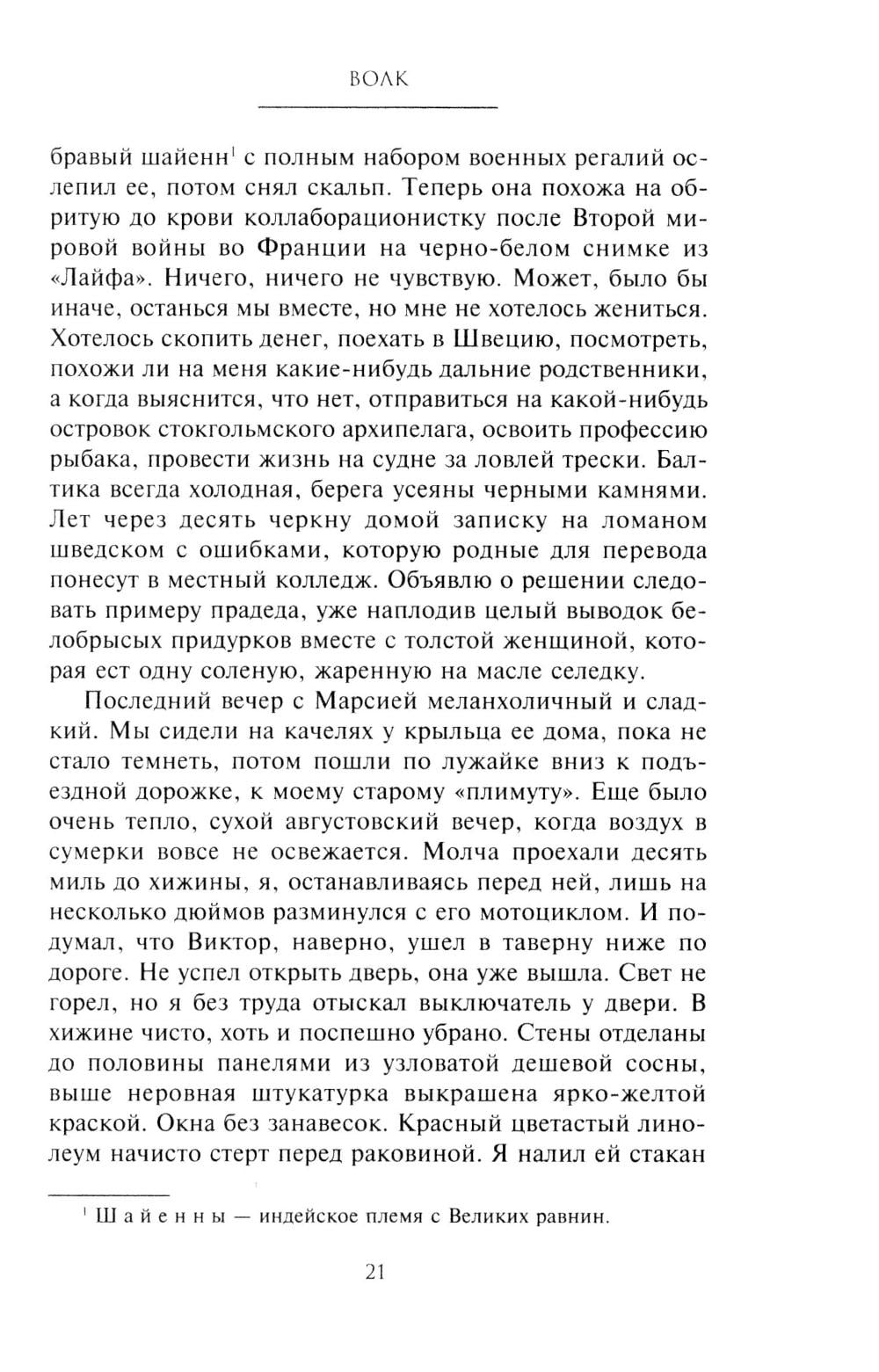 В романе одного из самых признанных, как читателями, так и критиками, современных американских писателей рассказана история потомка эмигрантов из Швеции, который отправляется в дикий лес Северного Мичигана в надежде увидеть последнего в здешних местах волка. Главный герой разочаровался в жизни, ничто не доставляет ему удовольствия: ни женщины, ни общение с друзьями, ни хмельные компании.