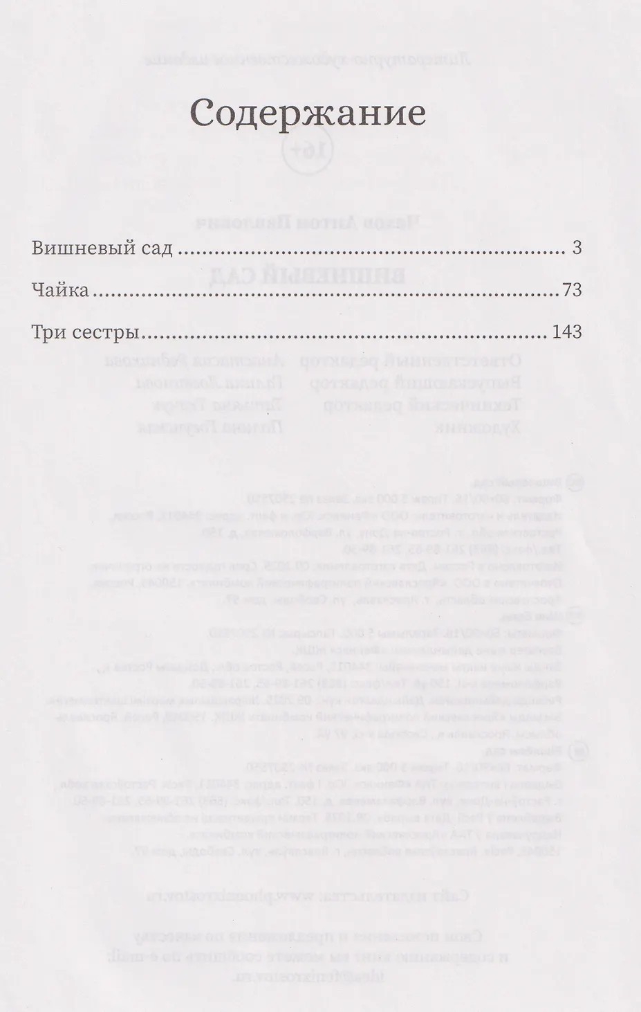 В сборник вошли три пьесы Антона Павловича Чехова: "Вишневый сад", "Чайка", "Три сестры".
