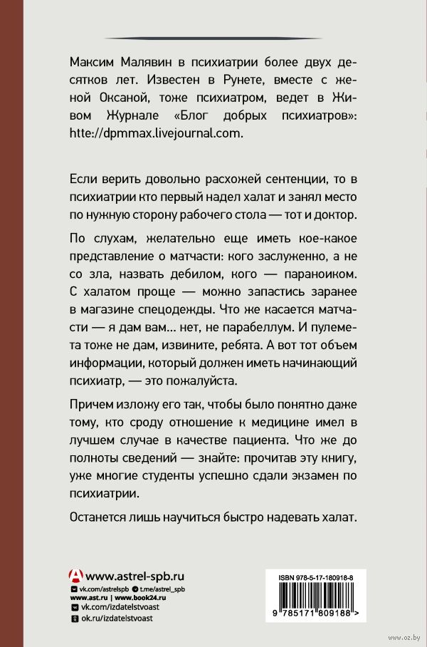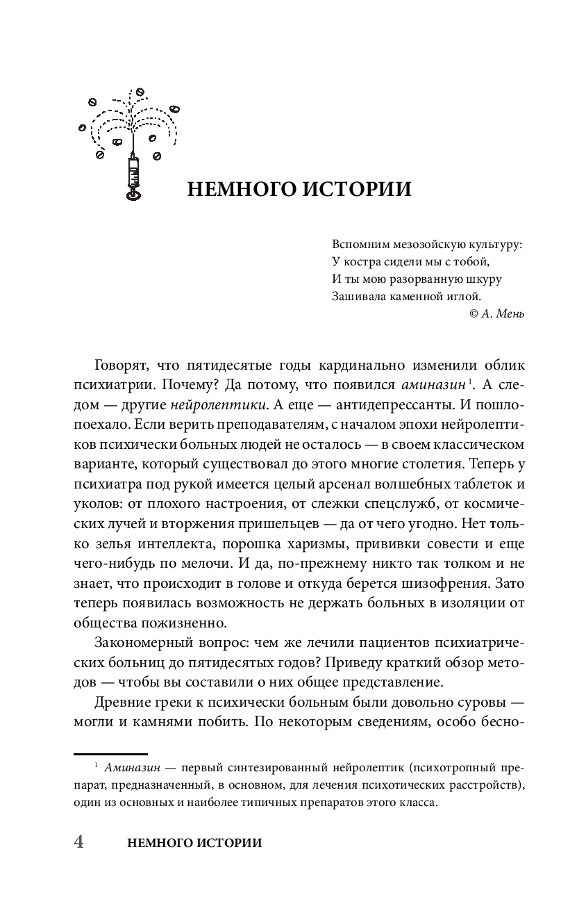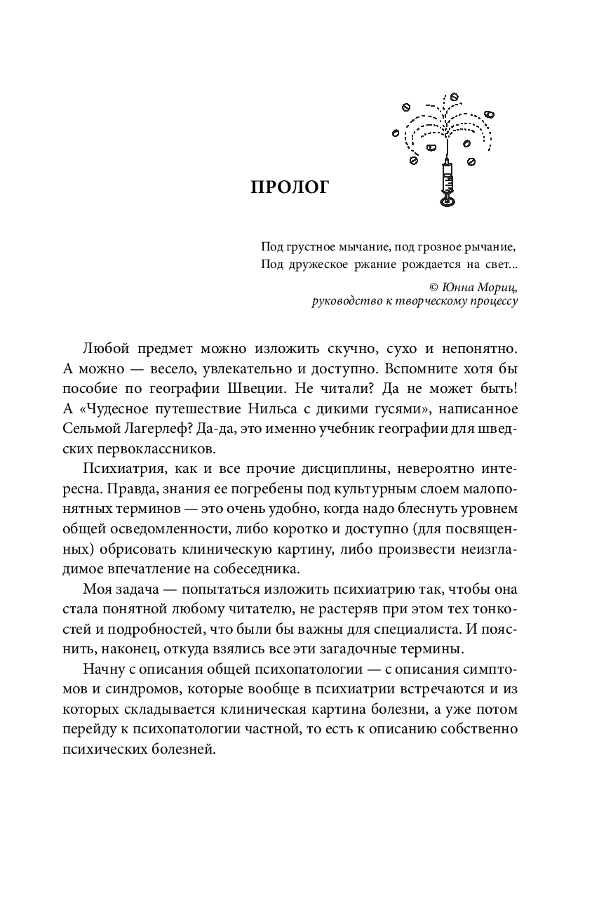 Если верить довольно расхожей сентенции, то в психиатрии кто первый надел халат и занял место по нужную сторону рабочего стола – тот и доктор. По слухам, желательно еще иметь кое-какое представление о матчасти: кого заслуженно, а не со зла, назвать дебилом, кого – параноиком. С халатом проще – можно запастись заранее в магазине спецодежды. Что же касается матчасти – я дам вам... нет, не парабеллум. И пулемета тоже не дам, извините, ребята. А вот тот объем информации, который должен иметь любой начинающий психиатр, – это пожалуйста. Причем изложу его так, чтобы было понятно даже тому, кто сроду отношение к медицине имел в лучшем случае в качестве пациента. Что же до полноты сведений – знайте: прочитав эту книгу, уже многие студенты успешно сдали экзамен по психиатрии. Останется лишь научиться быстро надевать халат.