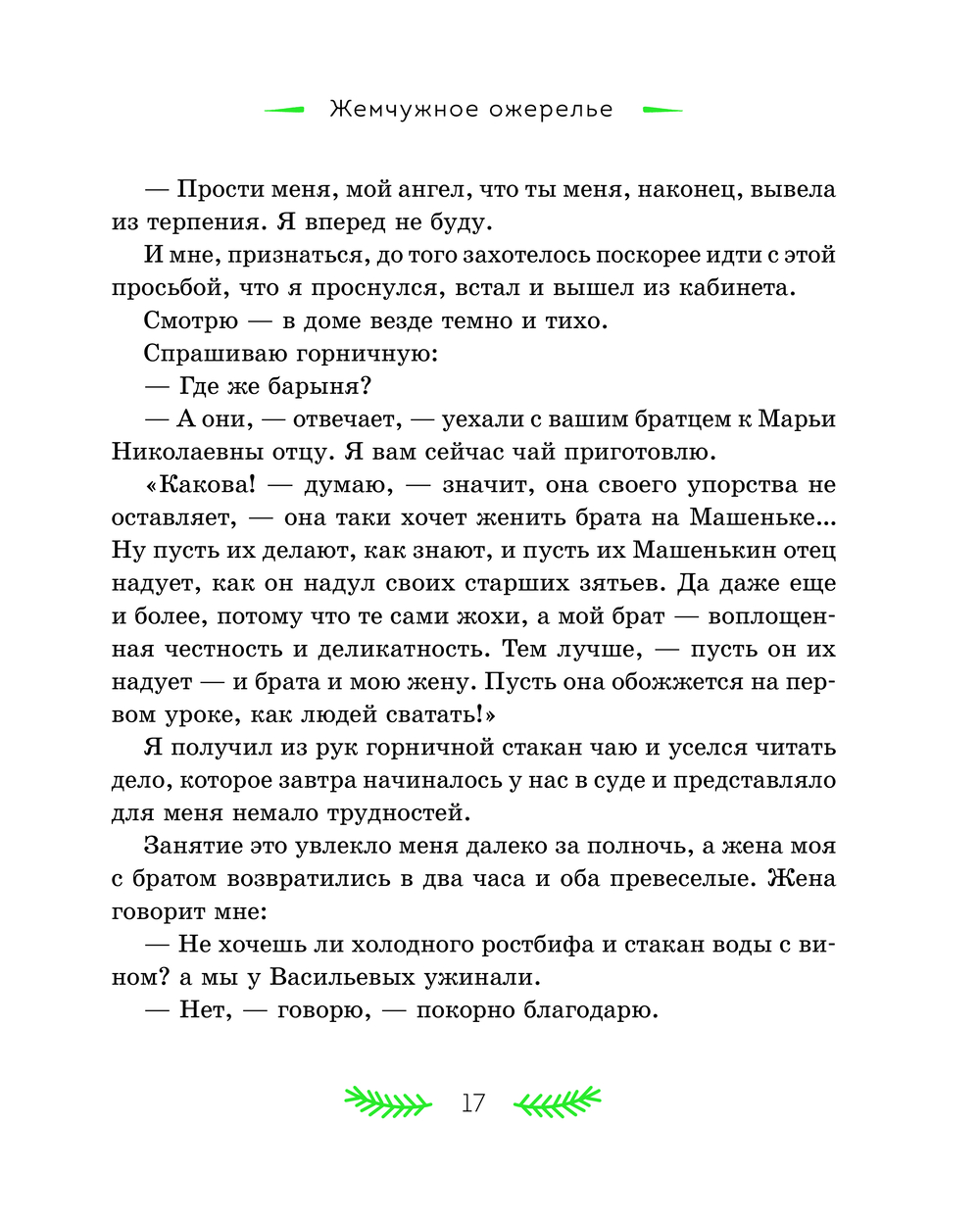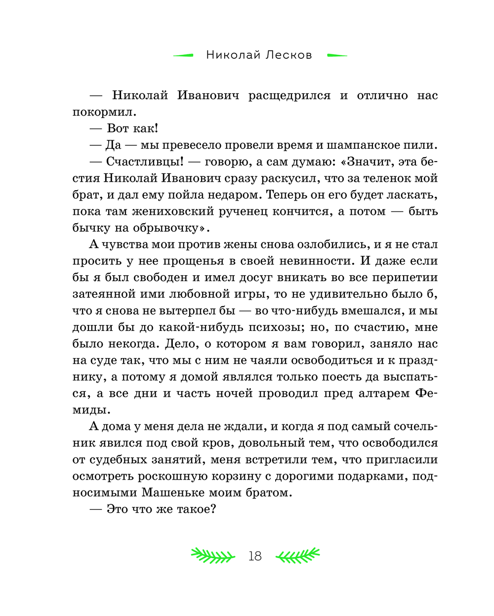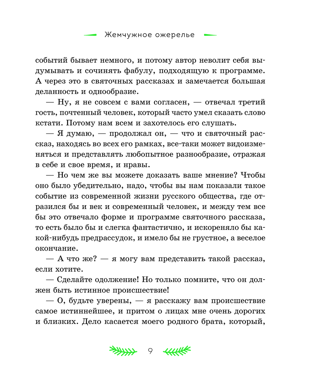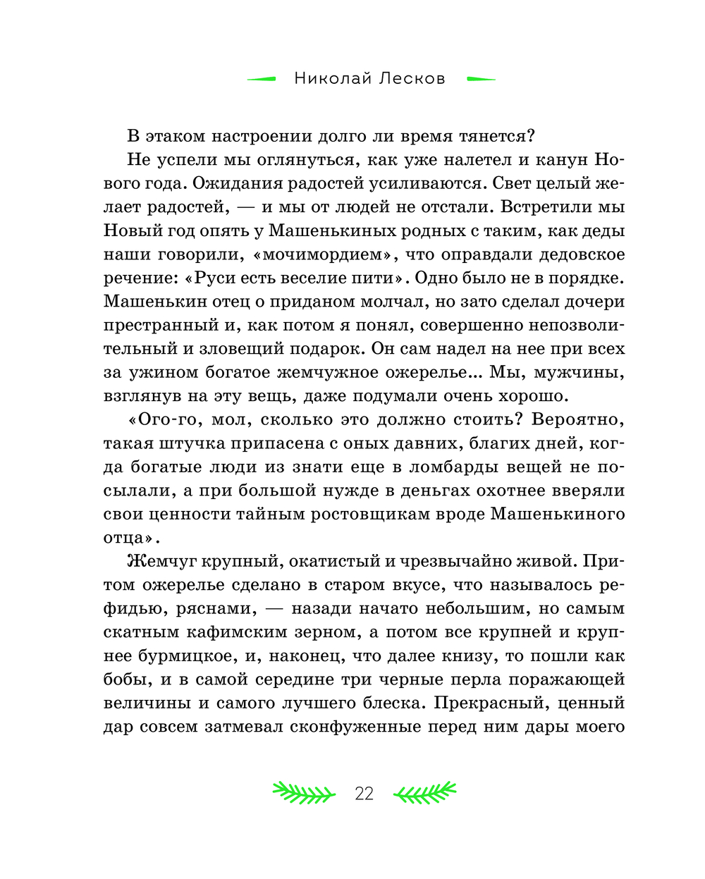 В литературном наследии Николая Семёновича Лескова святочные рассказы занимают особое место. Они стали призванием писателя – Лесков расширил традиционный жанр и дал ему новую жизнь. Персонажи его произведений – представители разных слоёв русского общества: помещики, чиновники, священники, купцы, военные и крестьяне. Для героя "Жемчужного ожерелья" случайная встреча стала прологом семейного счастья. "Неразменный рубль" рассказывает удивительную историю про маленького Колю и волшебную монету, "Отборное зерно" знакомит читателя с "правильным на вид" мужиком Иваном Петровым, помогающим двум плутам и мошенникам довести до завершения задуманную ими аферу, а "Пугало" повествует о злоключениях горожанина Селивана, которого людская молва волею случая записала в злодеи и колдуны. Рассказ "Зверь" показывает крепкую дружбу медведя и крестьянина, выстоявшая даже перед самодуром помещиком. Эти и другие рассказы в книге ведут к размышлению о природе добра и зла в человеке, о присутствии Бога в судьбе любого из нас, к переживаниям за жизни героев и их испытаниям.
