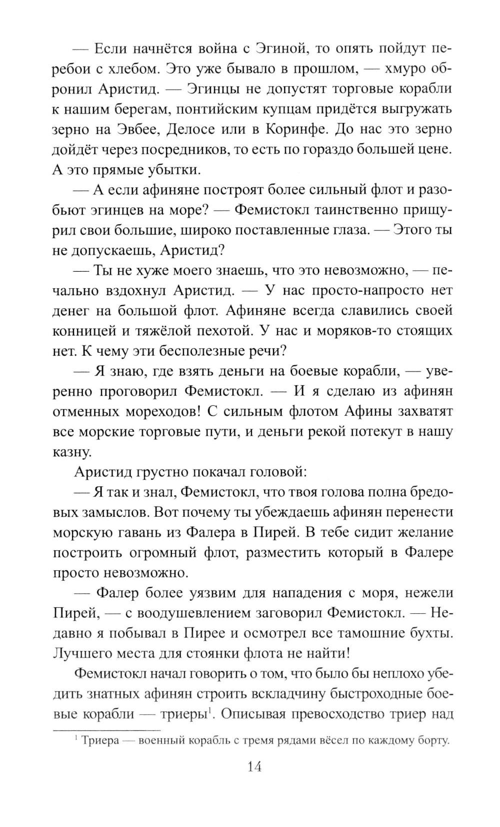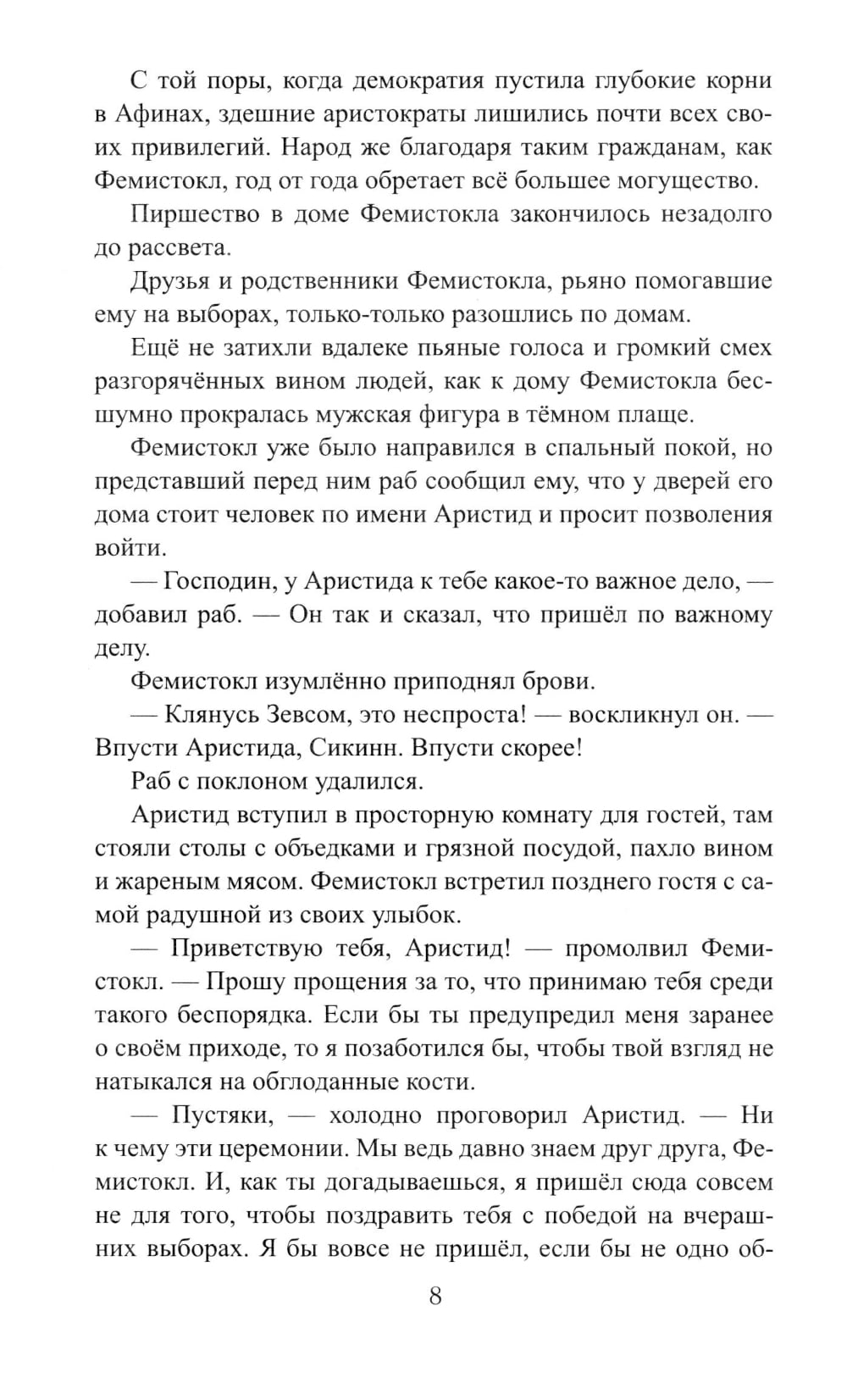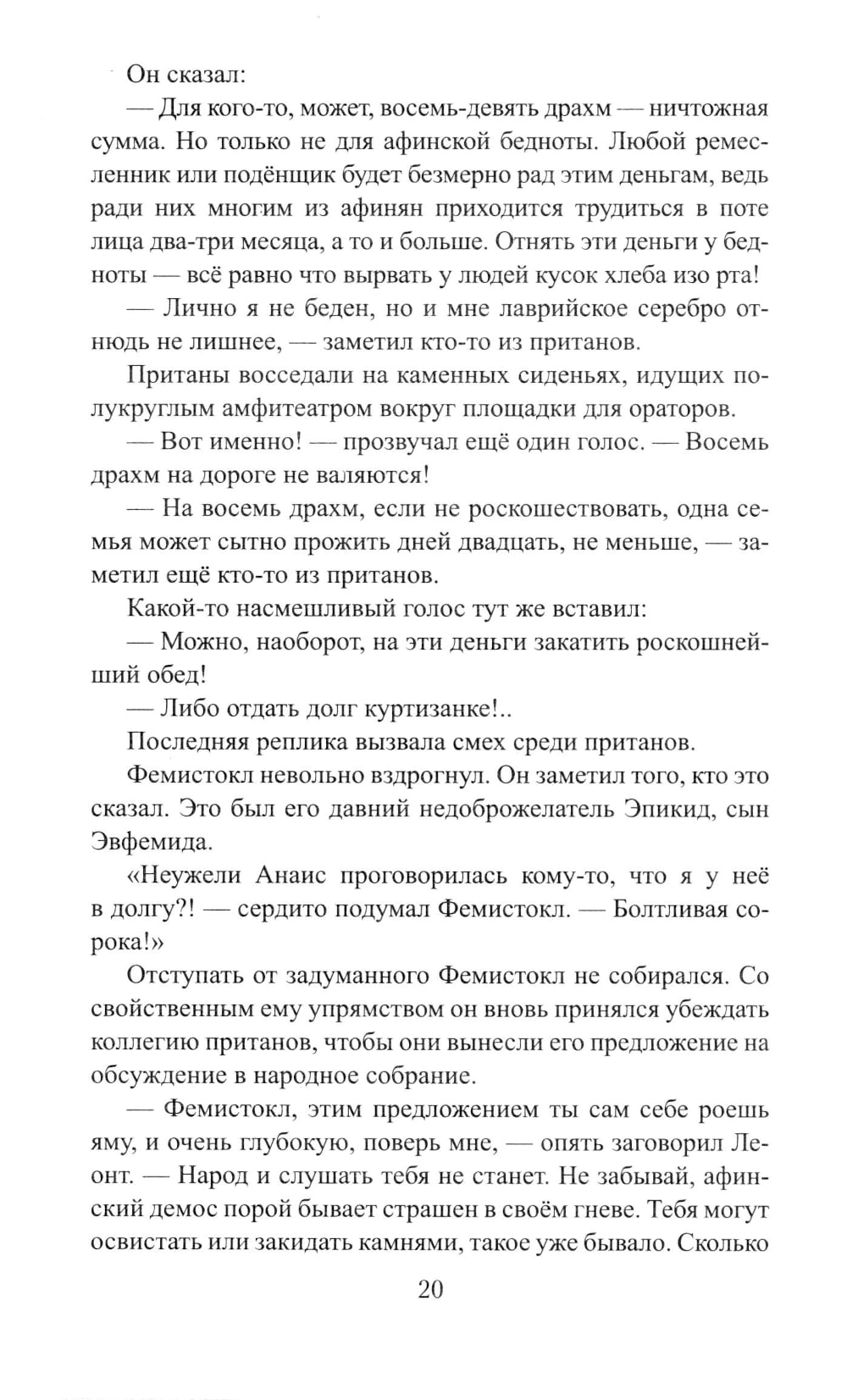 Он часто использует сомнительные методы. Например, нанимает продажных женщин, чтобы те своей прелестью заставляли политических соперников Фемистокла забыть обо всём и пропустить голосование по важному вопросу. Но главное – такие методы приносят пользу большинству афинян, а не кучке аристократов. Поэтому Фемистокла любит народ. И кто знает, чем закончилось бы знаменитое сражение с персидским флотом в Саламинском проливе, если бы Фемистокл в очередной раз не использовал сомнительные методы ради блага Афин и всей Греции.