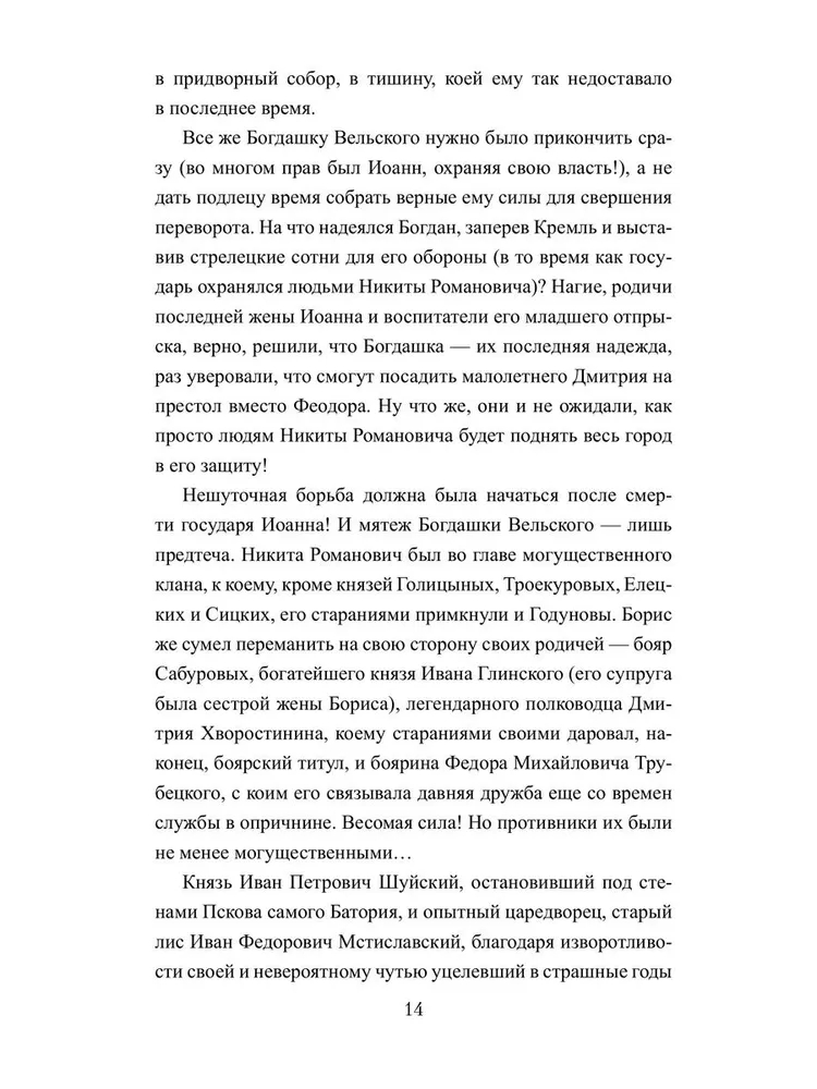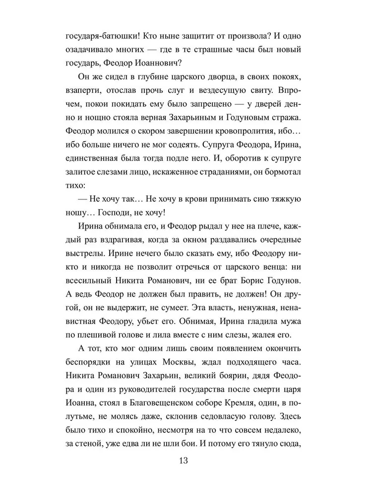 Русское царство конца XVI века. Сын Иоанна Грозного, Феодор, против воли принял власть над отцовской державой, разоренной и обескровленной. Феодор убежден, что все беды – расплата за грехи отца и дедов, поэтому проводит время в молитвах о спасении Русской земли, передав бразды правления своему шурину, Борису Годунову. Вот кому придется прилагать усилия, спасая государство, не давая погрузиться в великую Смуту. И с каждым днем это труднее. Нет под ногами твердой опоры, ведь всем ясно, что Феодор Иоаннович наследников не оставит, хоть и любит безмерно свою супругу, Ирину Годунову. Как долго сможет Борис одерживать верх в беспощадной придворной борьбе и защищать уже стоящую на пороге Смуты Россию?