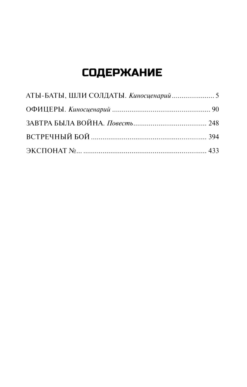 В сборник также включены другие пронзительные произведения автора, ставшие классикой военной прозы: "Офицеры", "Завтра была война", "Встречный бой" и "Экспонат №".