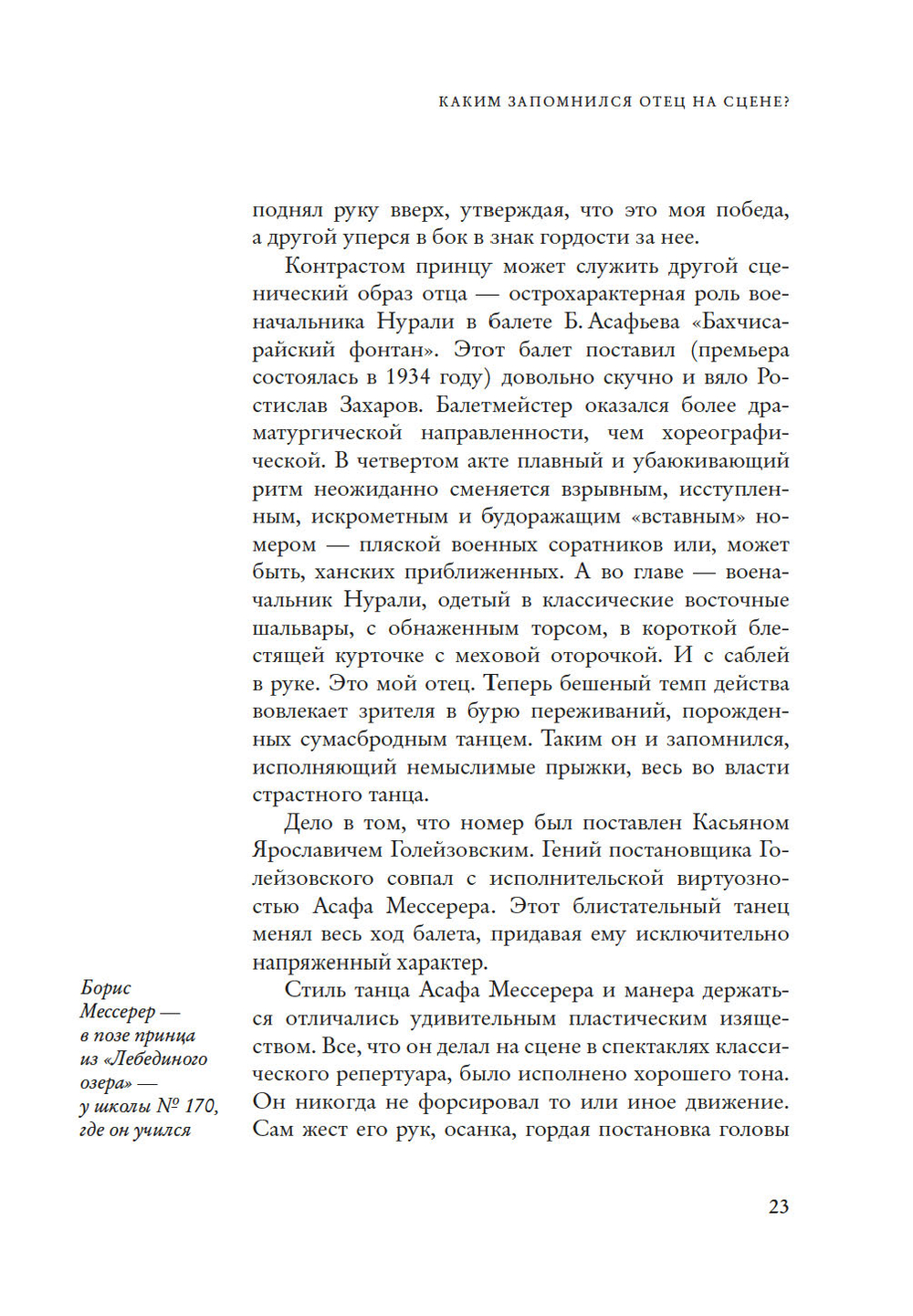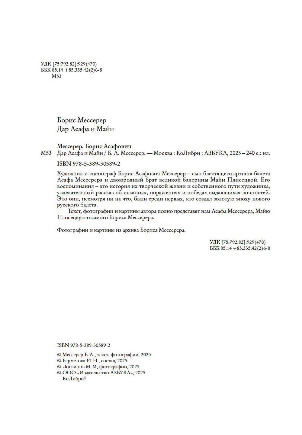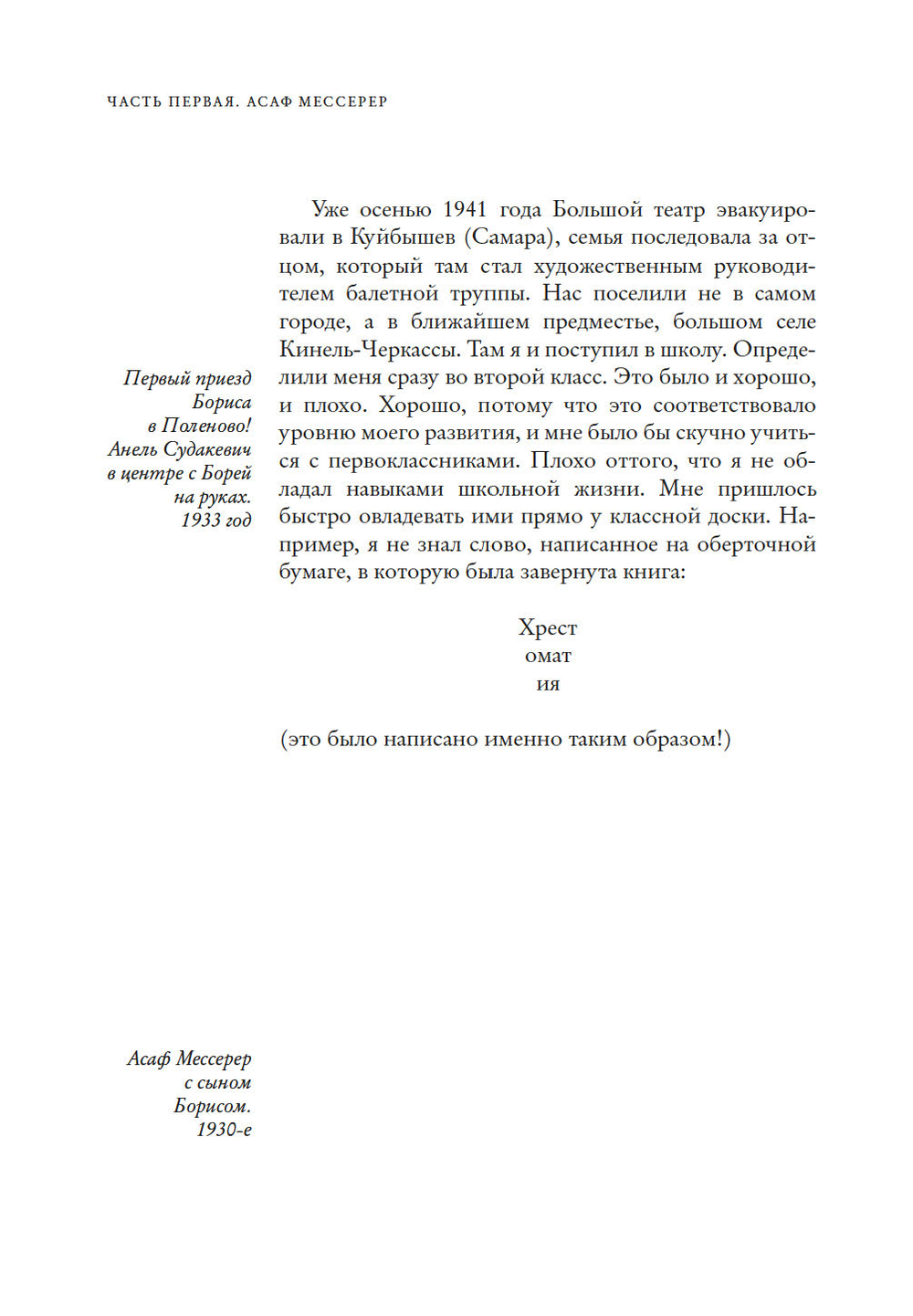 Художник и сценограф Борис Мессерер – сын блестящего артиста балета Асафа Мессерера и двоюродный брат великой балерины Майи Плисецкой. Его воспоминания – это история их творческой жизни и собственного пути художника, увлекательный рассказ об исканиях, поражениях и победах двух выдающихся личностей. Это они, несмотря ни на что, были среди первых, кто создал золотую эпоху нового русского балета.