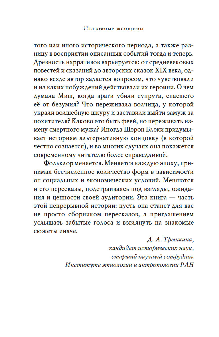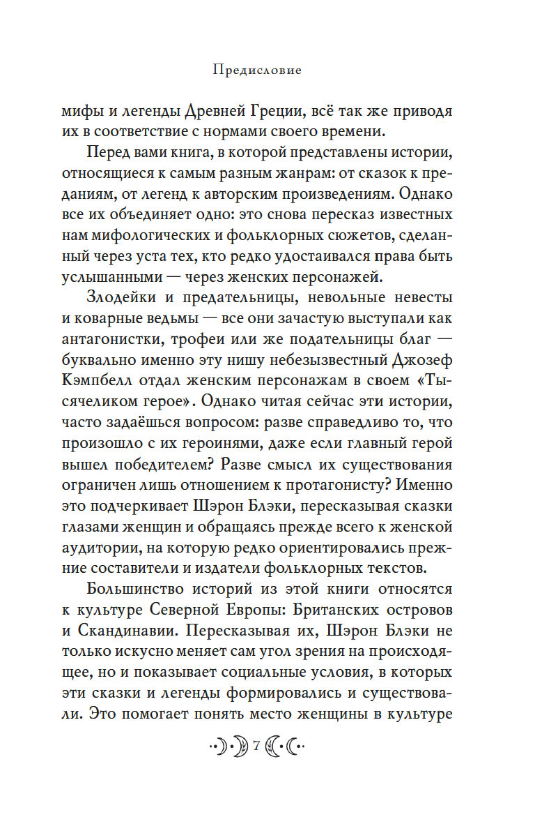 Задумывались ли вы когда-нибудь над судьбами женских персонажей в различных сказках, мифах, историях, которые нам рассказывали в детстве? Уверены, что не настолько, насколько этим озаботилась фольклорист-антрополог Шэрон Блэки. Изысканным поэтическим языком автор предлагает пересмотреть женскую роль в привычных всеми классических сюжетах и задаться вопросом, почему же во главу угла всегда ставятся мужчины, а женщин отодвигают на второй план и изобличают либо дополнением к мужу, либо злодейкой.