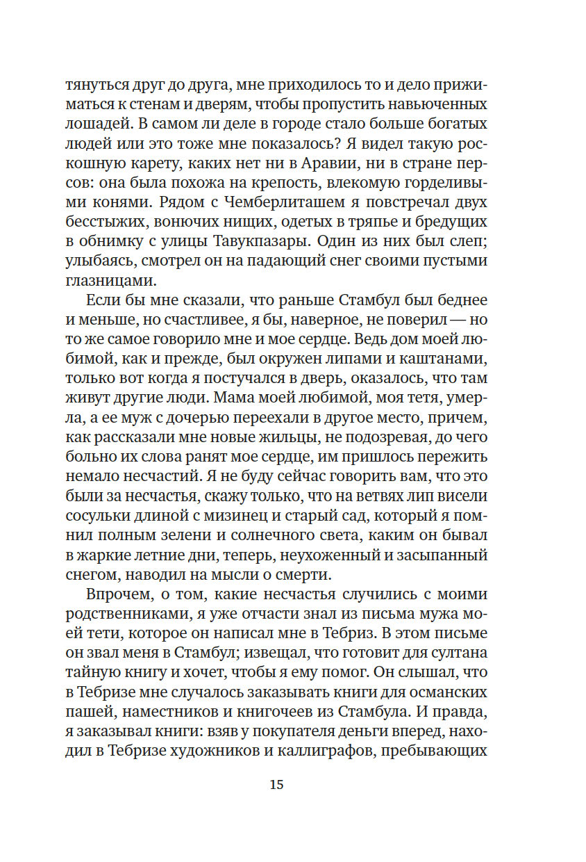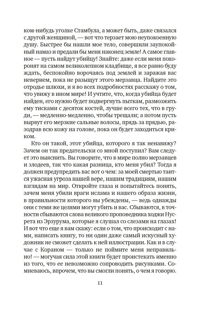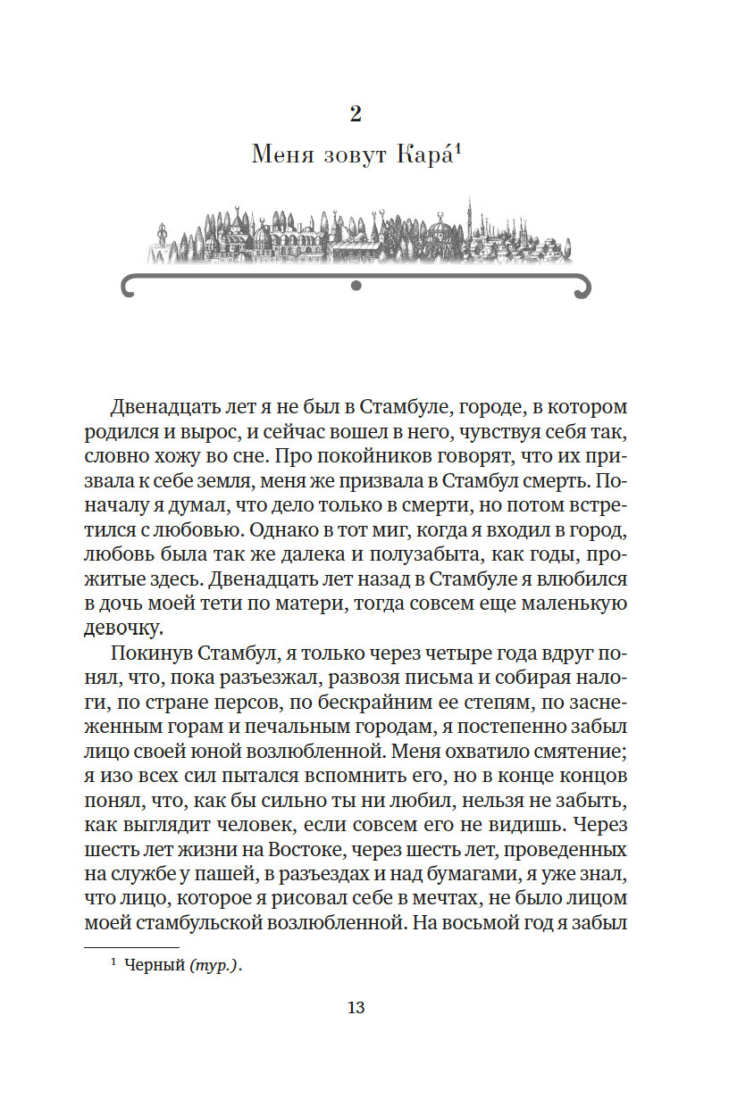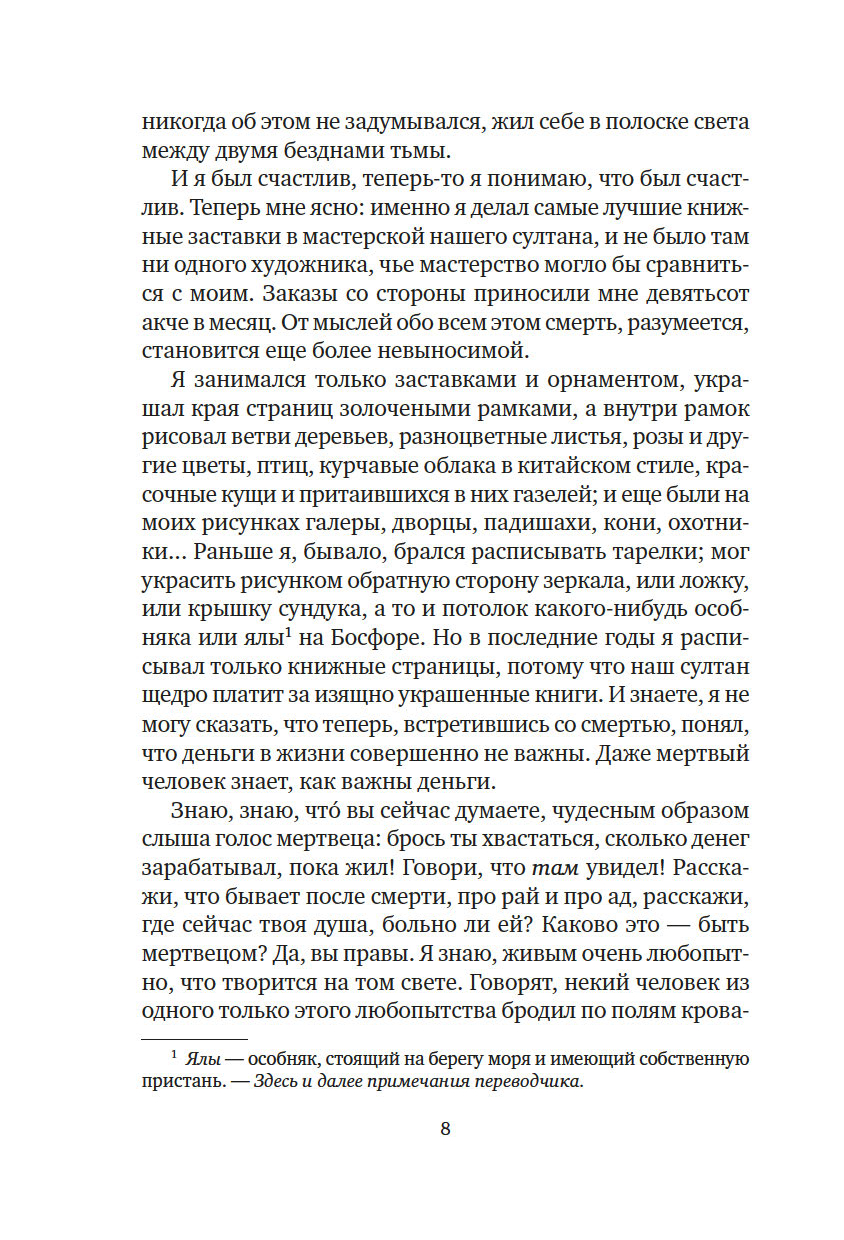 Четырем мастерам персидской миниатюры поручено проиллюстрировать тайную книгу для султана, дабы имя его и деяния обрели бессмертие и славу в веках. Однако по городу ходят слухи, что книга противоречит законам мусульманского мира, что сделана она по принципам венецианских безбожников и неосторожный свидетель, осмелившийся взглянуть на запретные страницы, неминуемо ослепнет. После жестокого убийства одного из художников становится ясно, что продолжать работу над заказом султана – смертельно опасно, а личность убийцы можно установить, лишь внимательно всмотревшись в замысловатые линии загадочного рисунка...